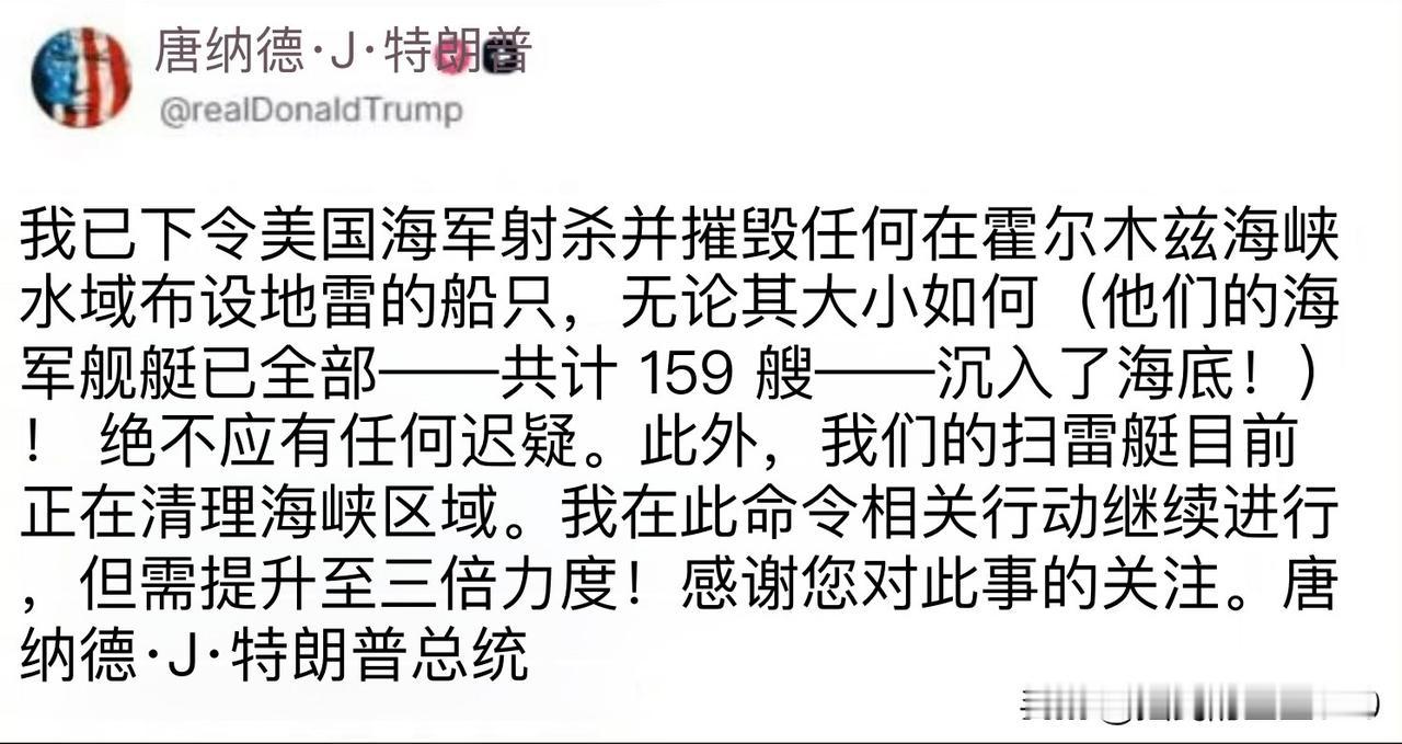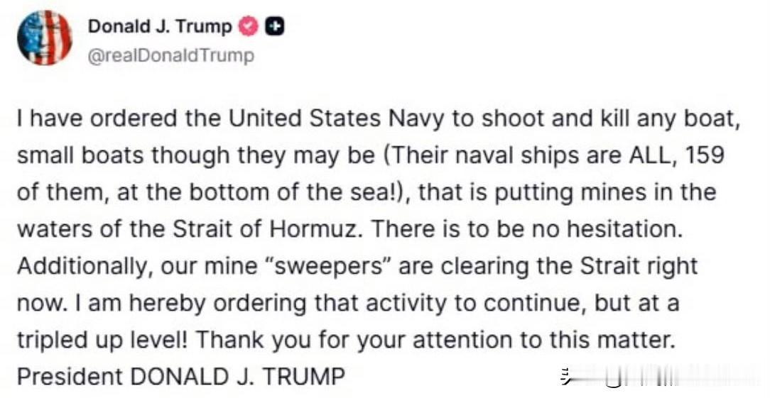 特朗普在其社交媒体上发文称,“我已经命令美国海军击沉任何在霍尔木兹海峡水域布设水雷的船只。绝不能有任何犹豫。”