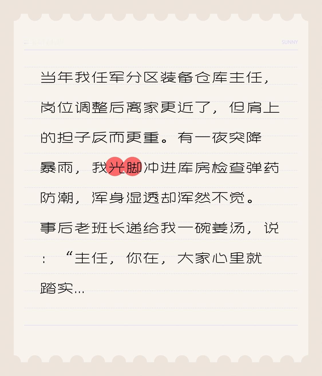 当年我任军分区装备仓库主任,岗位调整后离家更近了,但肩上的担子反而更重。有一夜突降暴雨,我光脚冲进库房检查弹药防潮,浑身湿透却浑然不觉。事后老班长递给我一碗姜汤,说:“主任,你在,大家心里就踏实。”一件小事,让我记了一辈子——带兵带的是心,守库守的是命。军旅回忆 责任担当