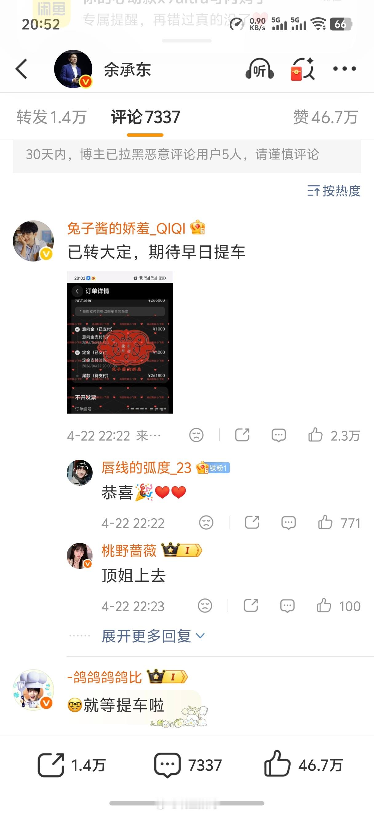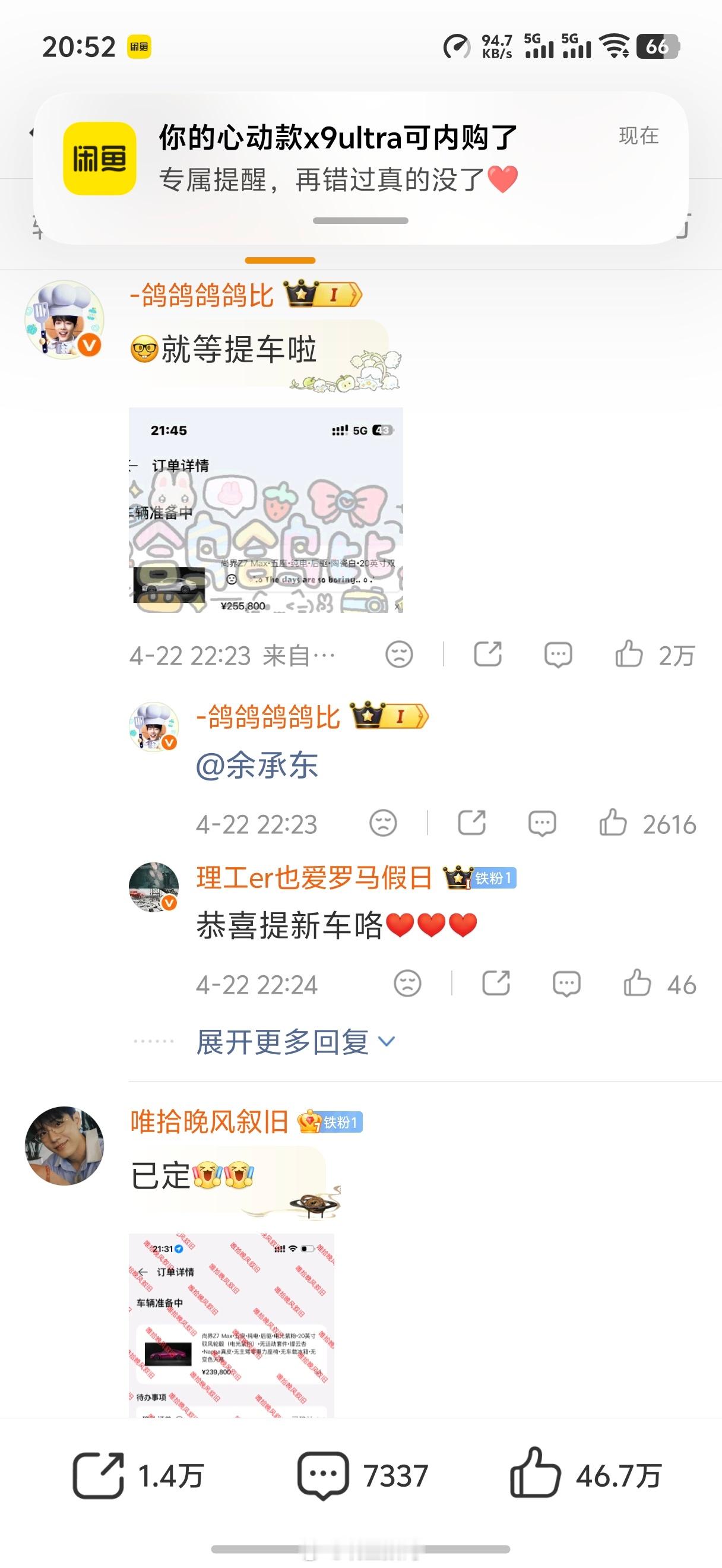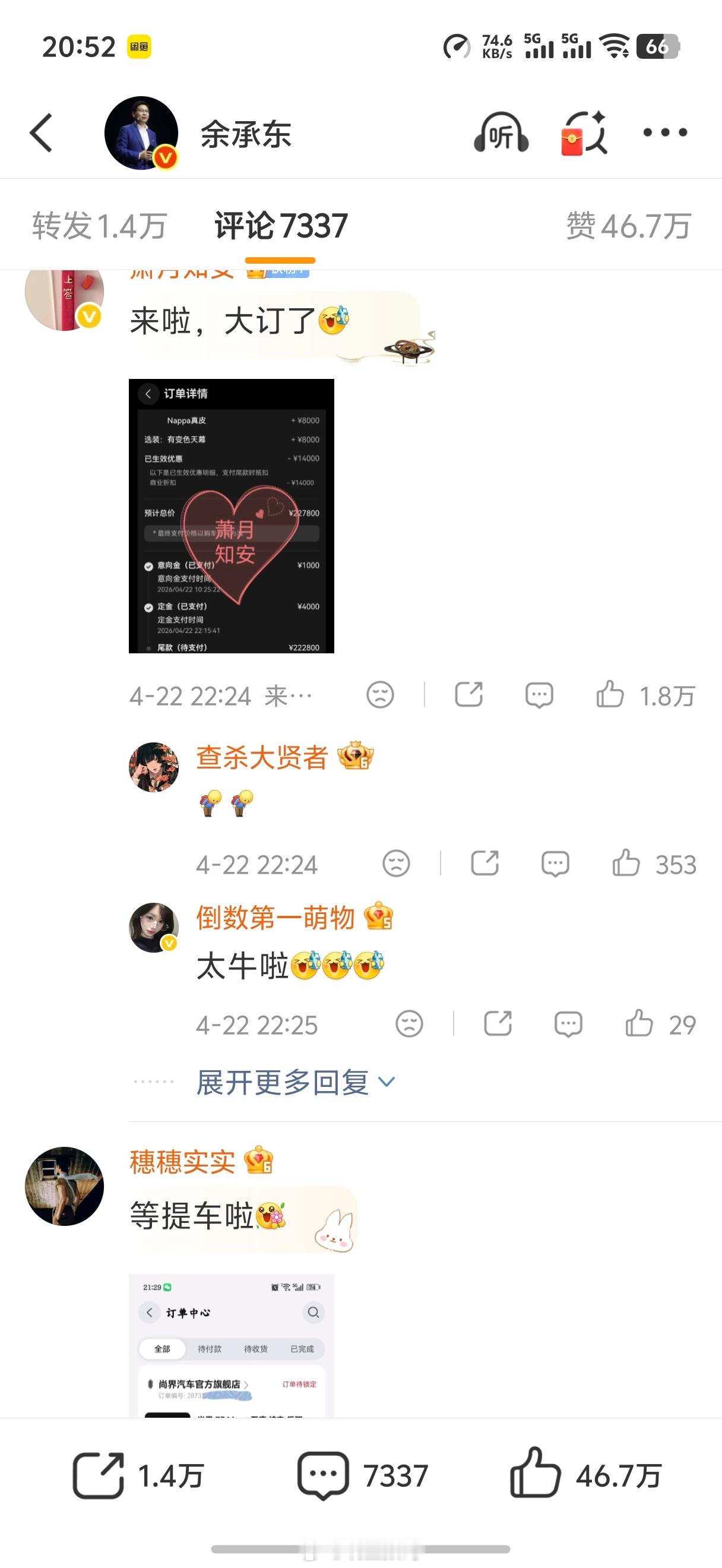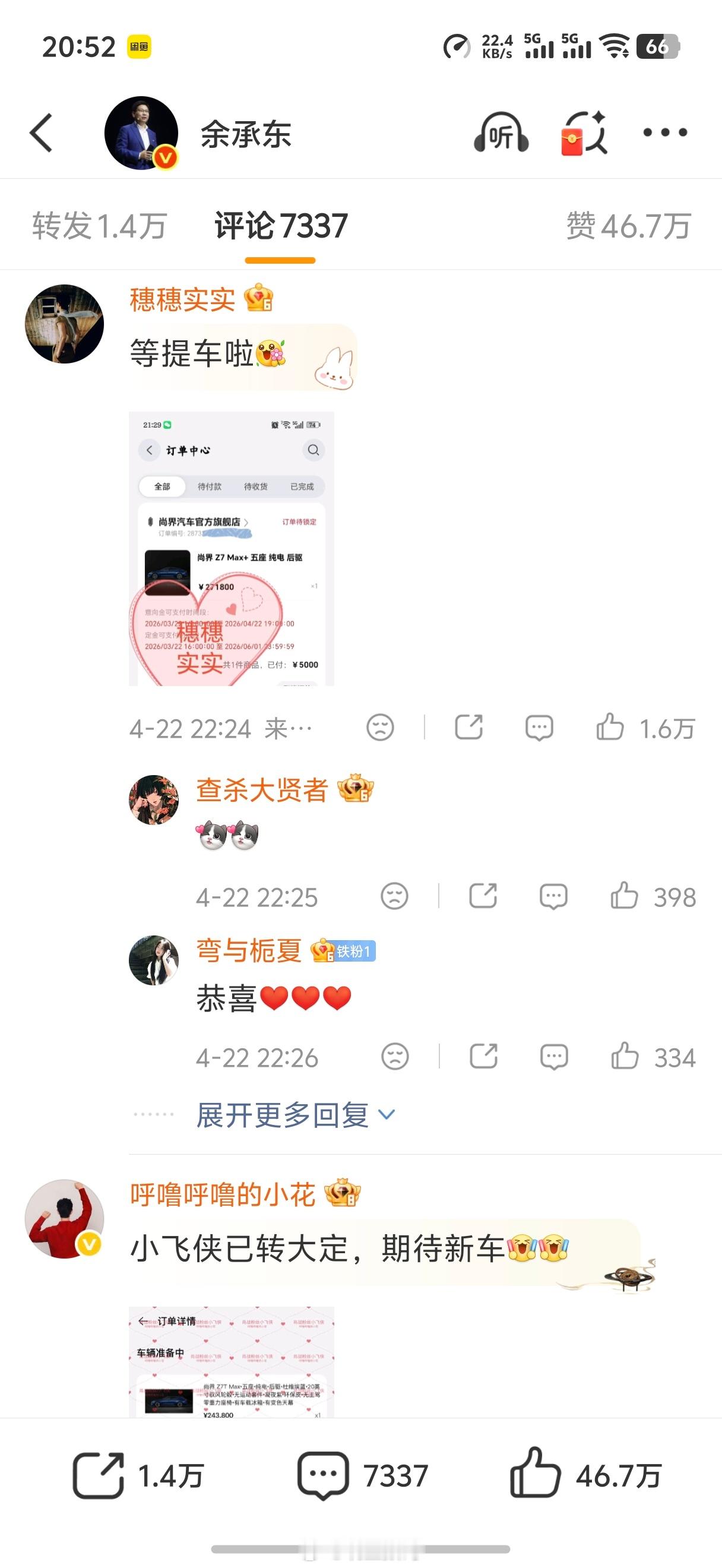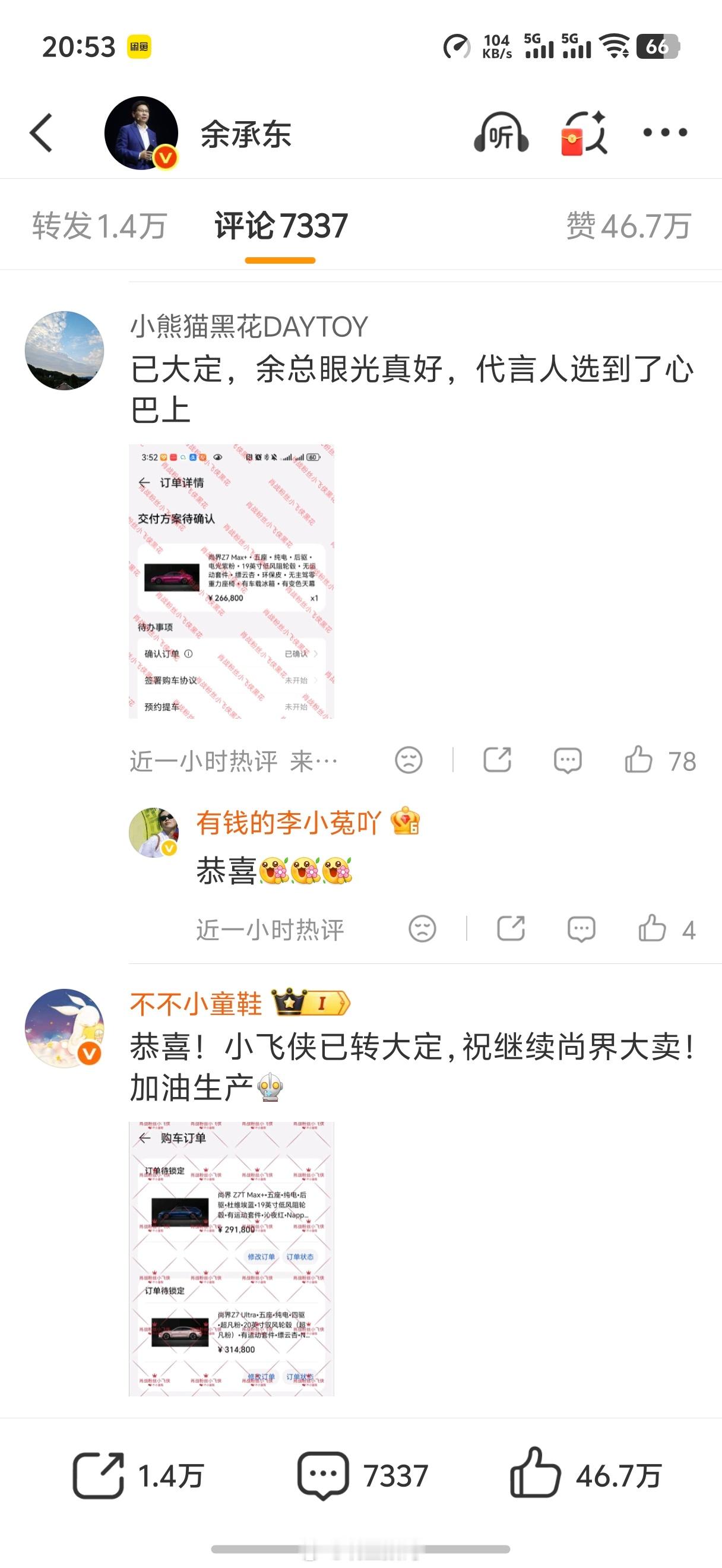 余承东这评论区底下,全都是肖战粉丝晒单尚界Z7的,真的太有钱了。上汽这波啊,赶紧交付啊