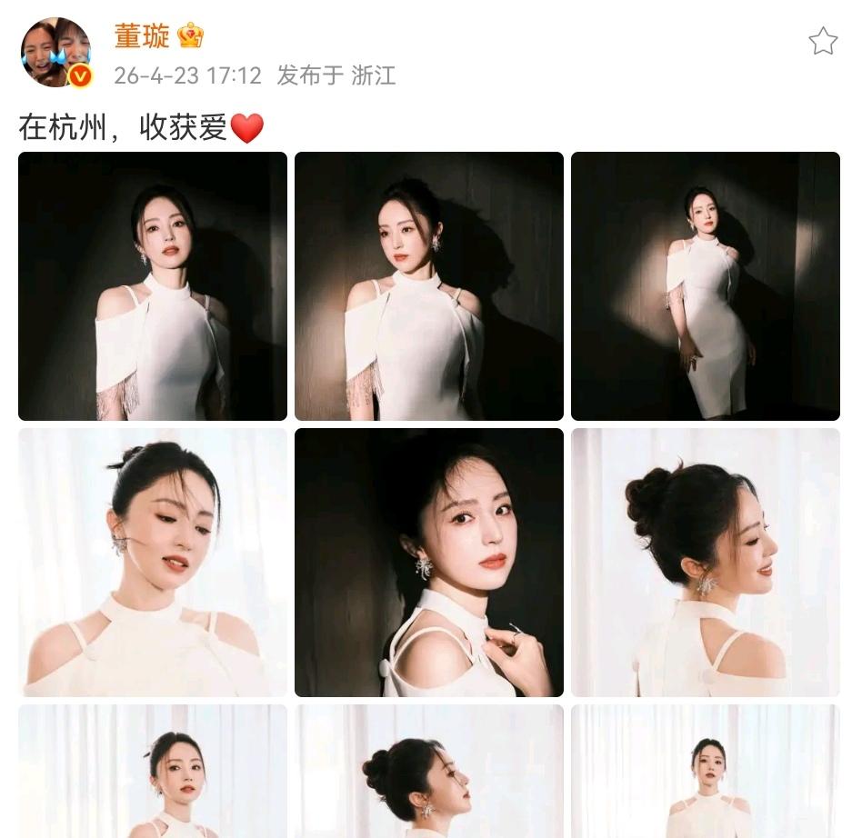 今天17:12时,董璇在个人账号晒出了一组美照,配文:在杭州,收获爱……