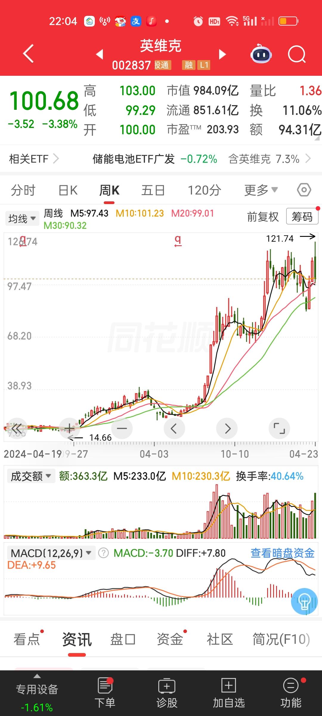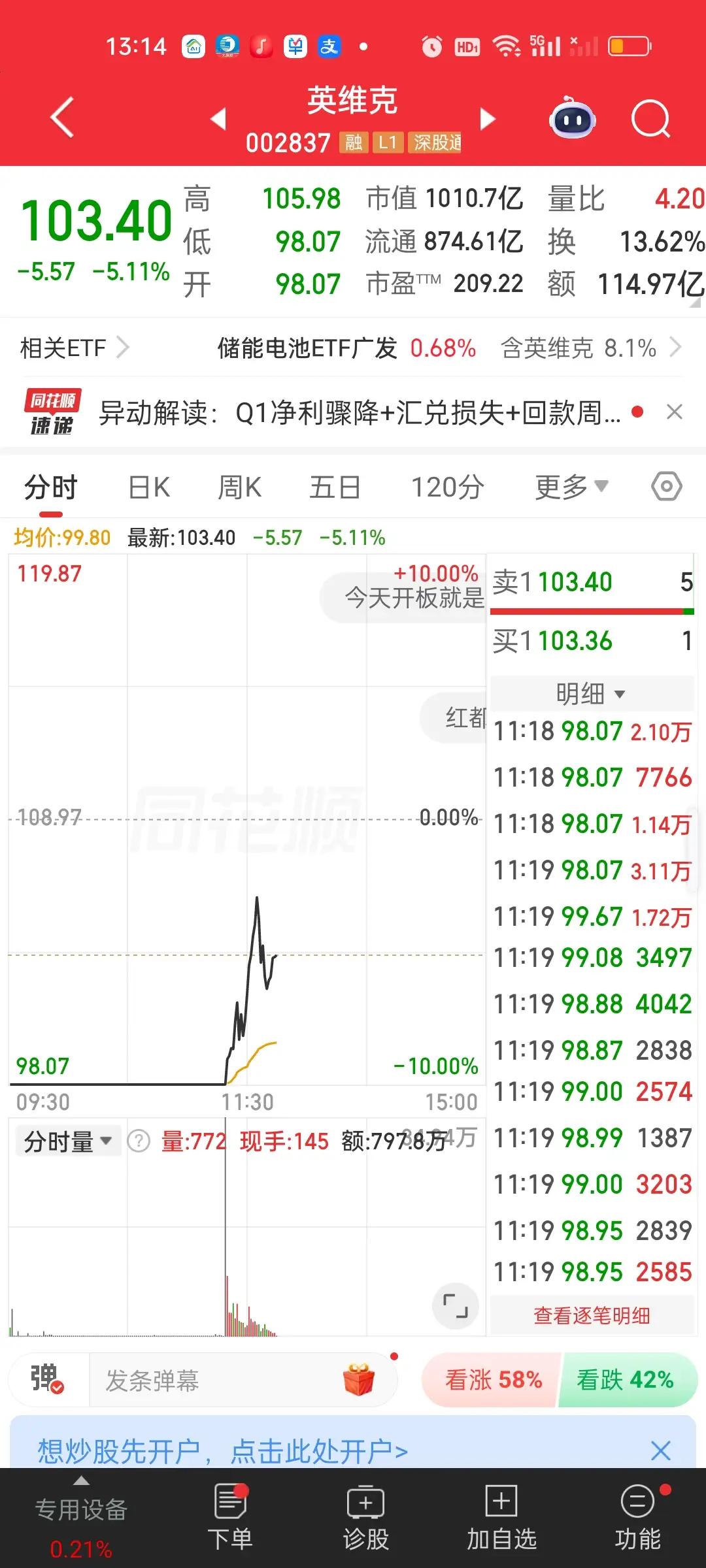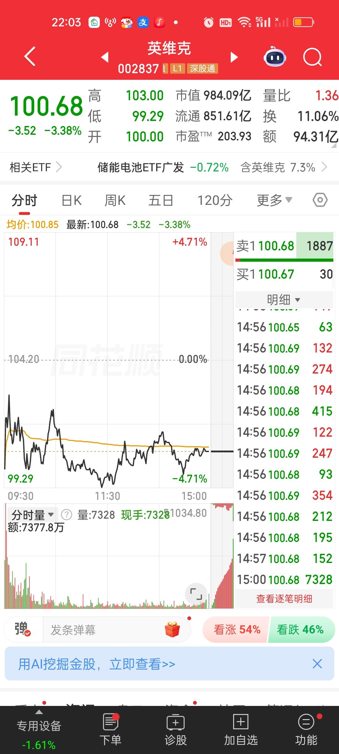 液冷龙头这几天的操作极端考验人性!跌停前一天还在暴涨创出历史新高121.74。前天直接来了个一字板跌停,收盘价108.97,昨天继续以跌停价98.07元开盘,本来这一切都很正常。事情的转折点出现在11:18分,10秒内41亿资金涌入秒开板。开板后一分钟内股价迅速站上103.4,也就是说除非昨天11:18分之前以跌停价98.07元买进的,今天卖出有利润,其它时间买进的昨天收盘就算有利润也只是纸面富贵。