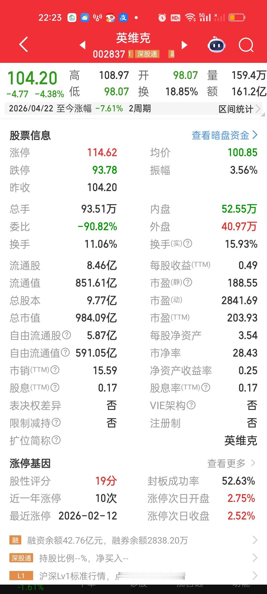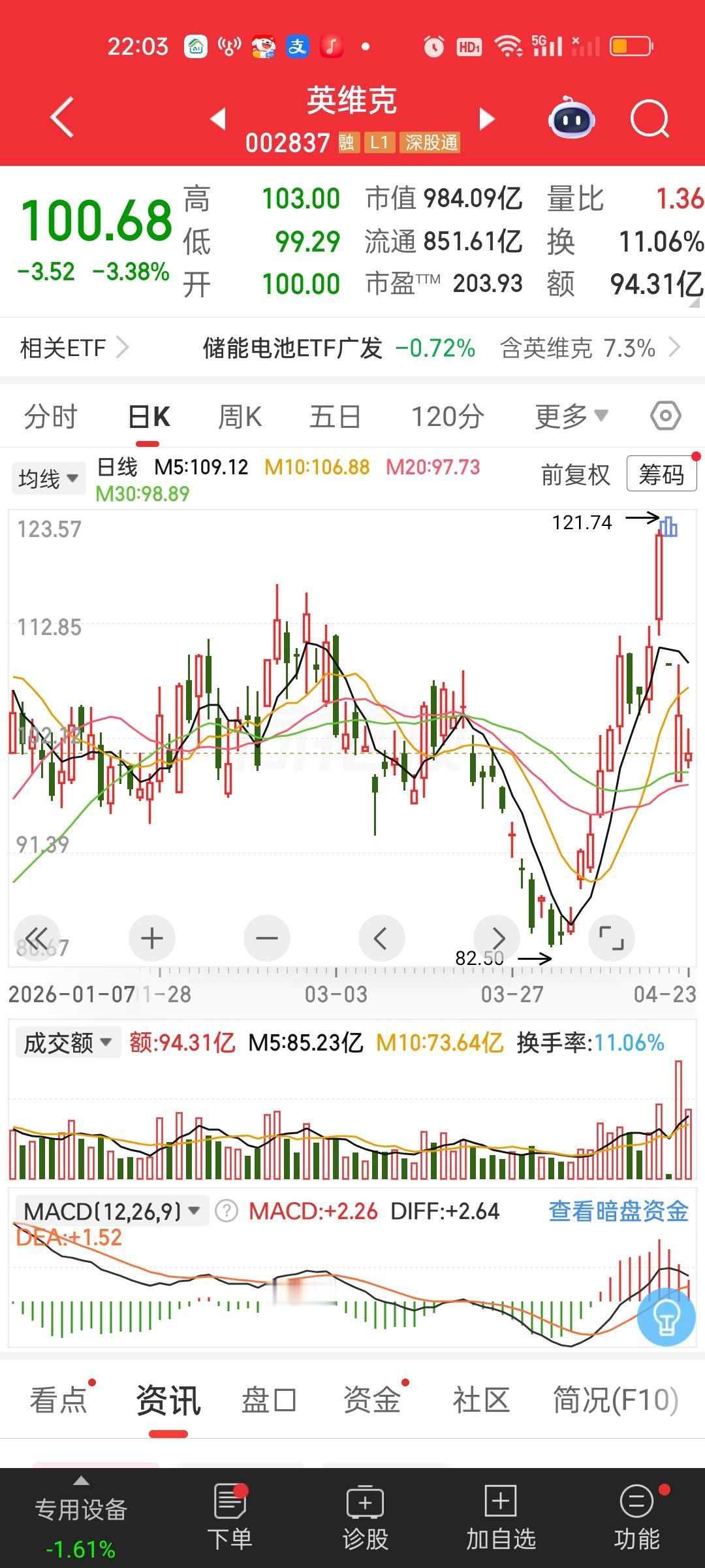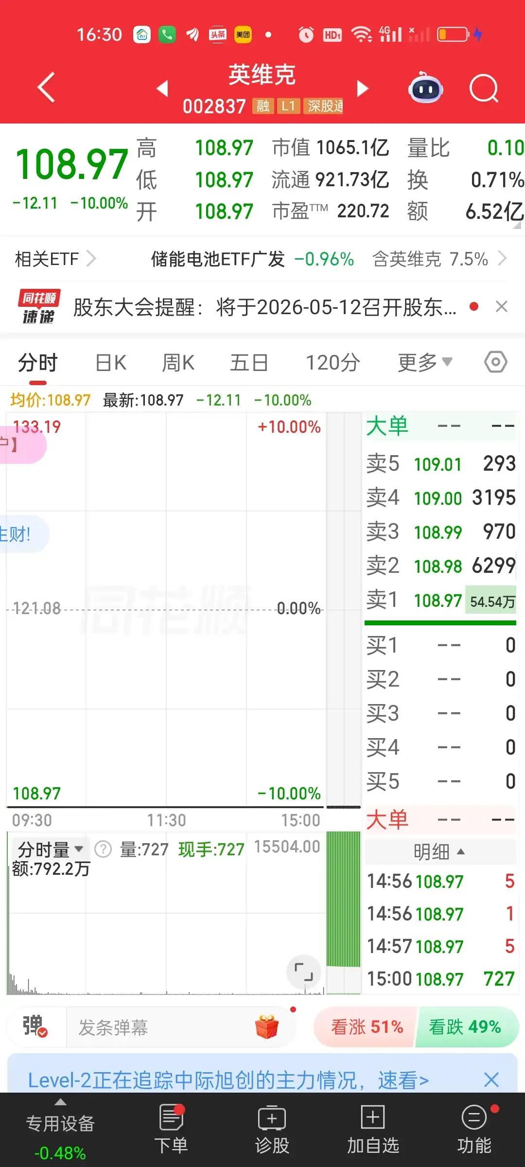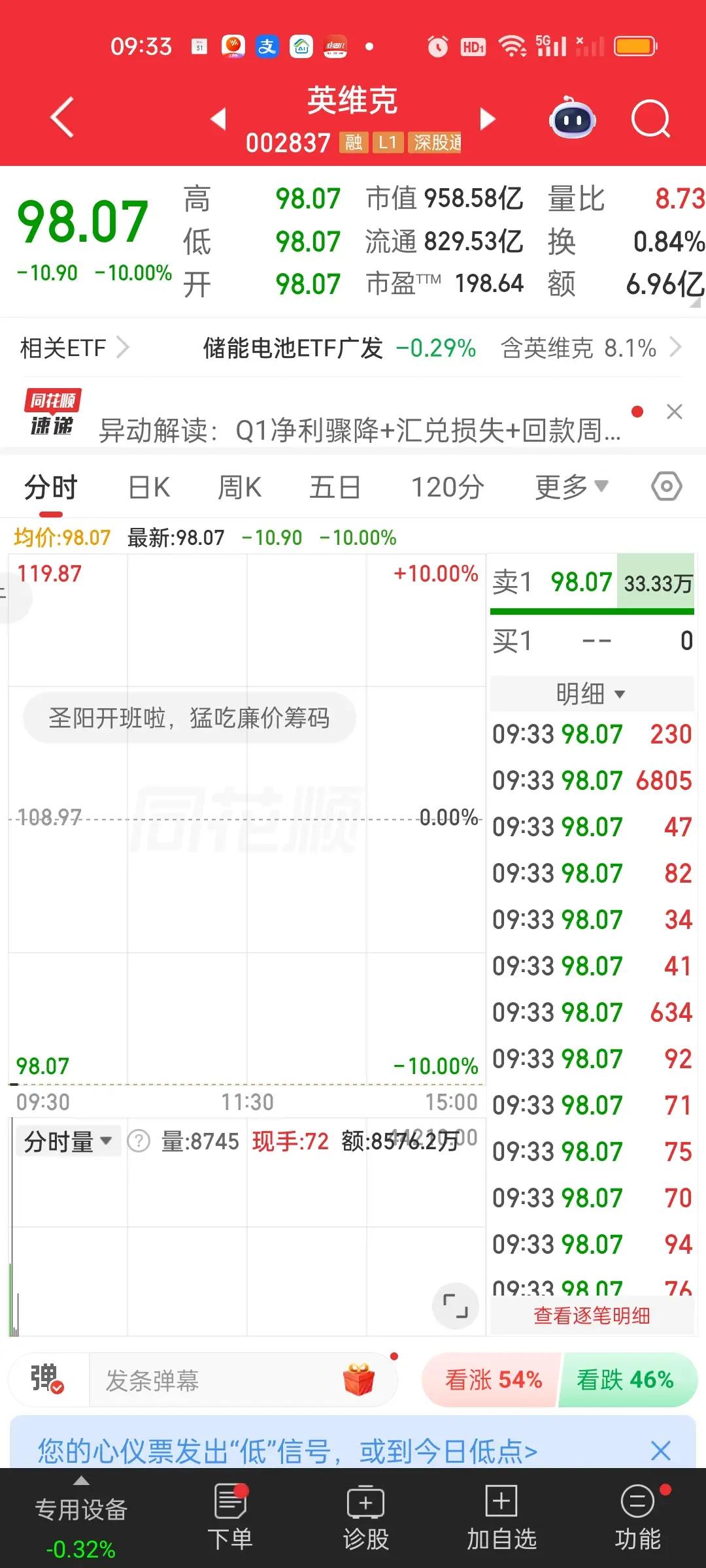 液冷龙头这几天的操作极端考验人性!跌停前一天还在暴涨创出历史新高121.74。前天直接来了个一字板跌停,收盘价108.97,昨天继续以跌停价98.07元开盘,本来这一切都很正常。事情的转折点出现在11:18分,10秒内41亿资金涌入秒开板。开板后一分钟内股价迅速站上103.4,也就是说除非昨天11:18分之前以跌停价98.07元买进的,今天卖出有利润,其它时间买进的昨天收盘就算有利润也只是纸面富贵。