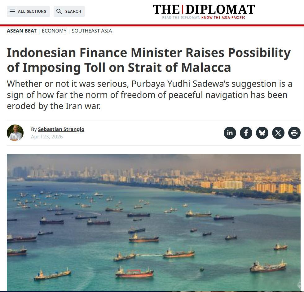 印尼财长萨德瓦在雅加达的一个研讨会上提出马六甲海峡是全球重要贸易通道,印尼、马来西亚、新加坡三国可共同分摊收益。