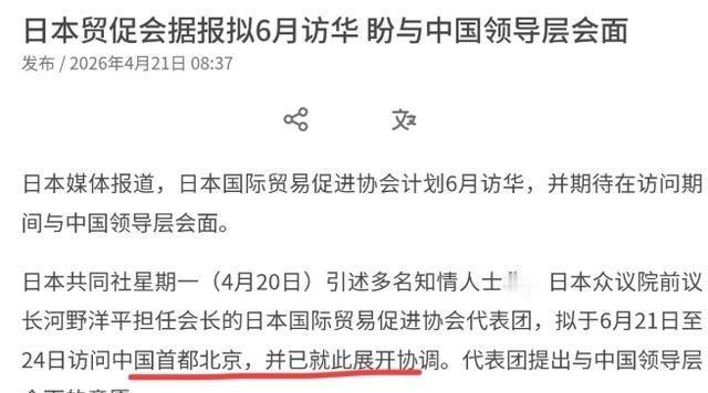 日本等不及了!希望我们松口,同意其访问请求!4月21日,根据日本共同社报道,日媒援引多名知情人士称,日本众议院前议长河野洋平担任会长的日本国际贸易促进协会代表团,拟于6月21日至24日访问中国首都北京,并已就此事展开协调。该代表团表示,他们希望与中国领导层会面,希望中方能够同意。