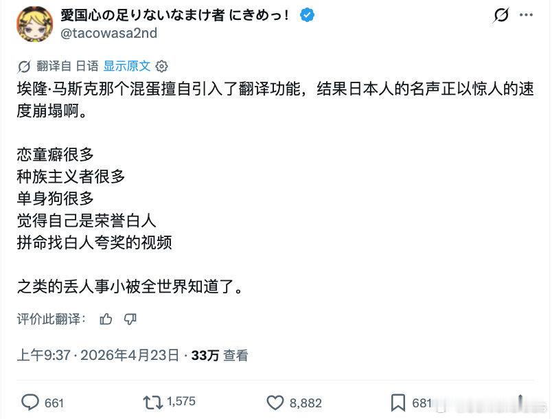 实际上,马斯克一开始是和日本网右互动后,给日本网右推流的。日本网右亲美,舔特朗普和马斯克不是一天两天。那几天马斯克也狂的没边。没想到推流之后,由于日本网右太逆天,直接导致日本人风评烂大街。完全可以入选“本意是坏的,但是执行好了”的经典案例。