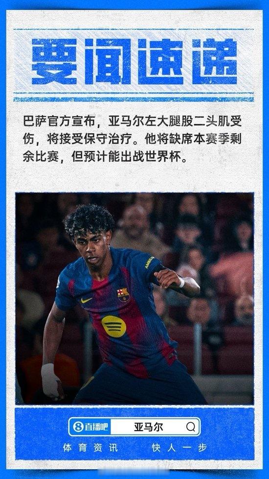 4月23日讯 巴萨官方公布亚马尔伤情,亚马尔大腿股二头肌受伤,赛季报销,预计能够赶上世界杯。医疗通告经检查确认,一线队球员拉明·亚马尔左大腿股二头肌受伤。