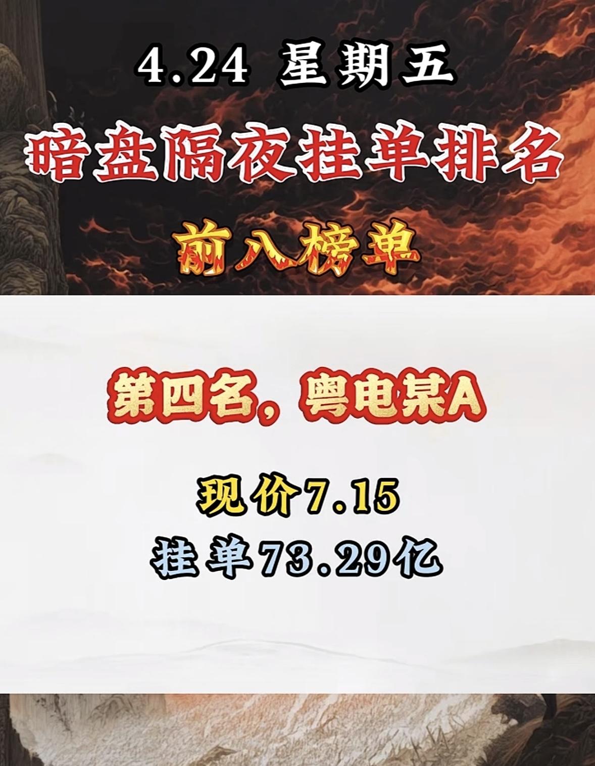 4月24日暗盘隔夜挂单排名前八榜单新鲜出炉啦!第一名是三安光电,接着是华电疗能、金螳螂等。这暗盘隔夜挂单就像资本市场的“提前占座”,投资者在收盘后到次日开盘前提前提交买卖委托。