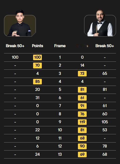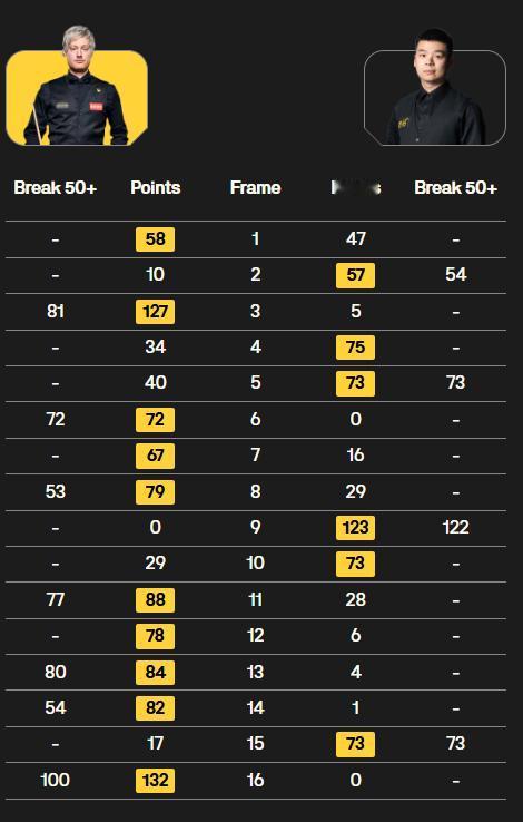首阶段两人有来有回,5-4仅一局之差,这使得晋级充满悬念。进入第二阶段的角逐,庞俊旭先胜一局成功追平,但此后时间上手次数越来越少,偶尔的机会也未能很好把握,渐渐被甩开差距。罗伯逊则是彻底掌控节奏,准度高,且思路相当清晰,连接非常流畅,直接四连鞭率先拿到赛点,最后用单杆破百结束,以10-6获得最后一个16强的席位。