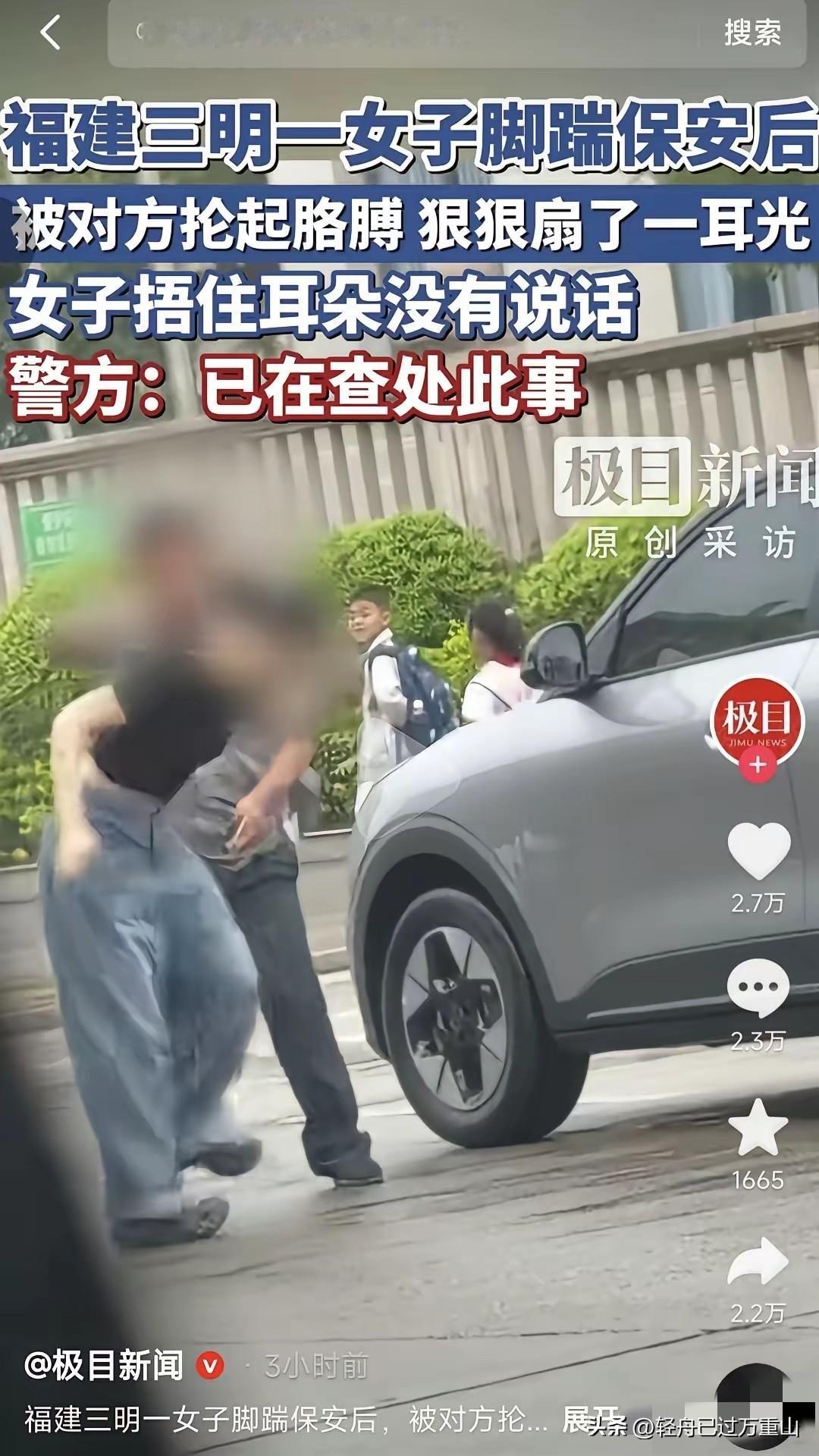 就这一脚,保安惹急了,直接上前就是一大巴掌,看得出来这巴掌保安是卯足劲打过去的,应该是当时非常生气了,打的声音很响亮,打完还恶狠狠看着女车主如何还击,此时女车主要是再出手,他那不好惹的表情应该还会下手更重。这保安有暴力倾向,这轻轻踢一脚换来一大巴掌,要是面前站着的是一个彪壮男人,他还敢扇人家一巴掌吗?