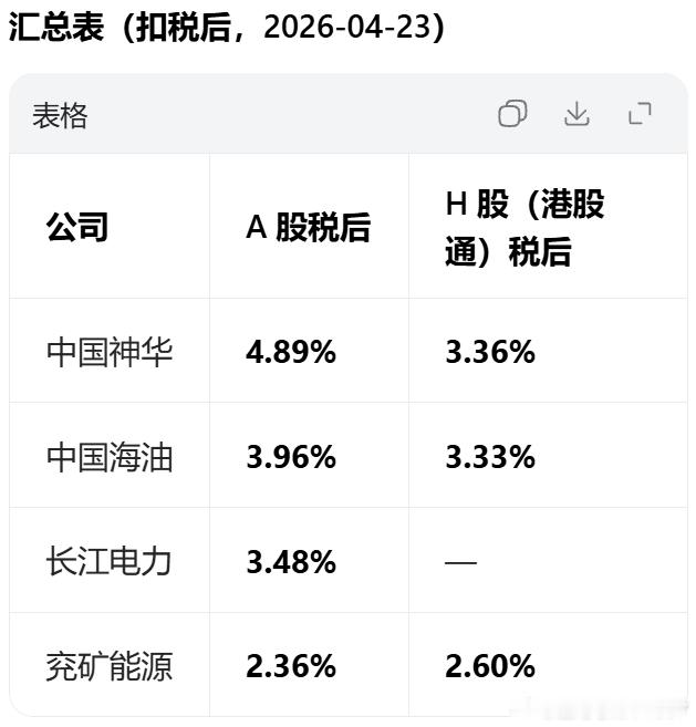中国神华a股,税前股息率5.15%,扣5%税后4.89%。h股,税前股息率4.66%,扣 28% 税后≈ 3.36%