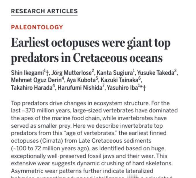 白垩纪巨型章鱼体长可达19米,曾称霸海洋食物链顶端。   长期以来,人们普遍认为