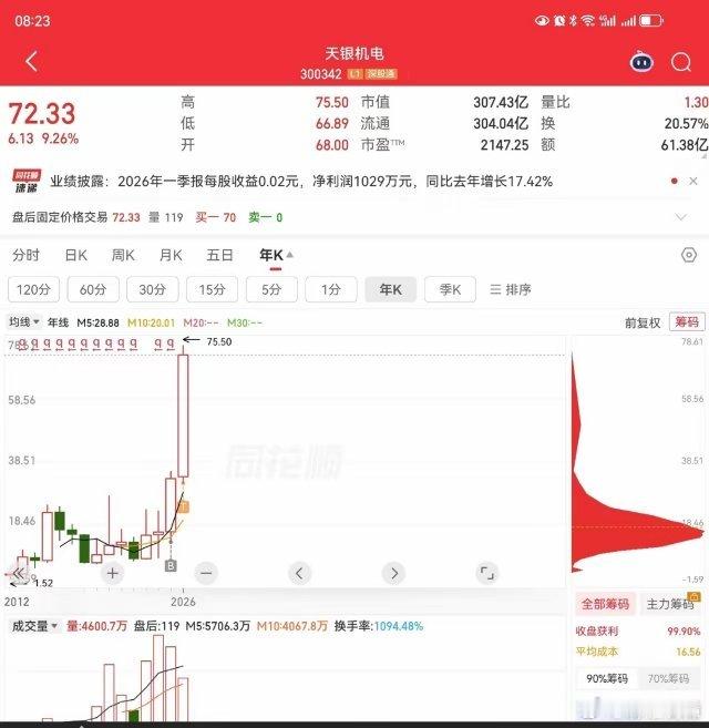 曾经有海峡创新,被散户们买到涨不停,和不停涨!如今又出来天银机电,天银机电在股价表现方面,持续创下历史性新高,但同样是被散户持续买入到涨不停,和不停涨。听说这里面,还有一个90后的牛散大佬,在2025年的4季度,一次性的买入了1416万户,一度成为天银机电的第三大股东,那么以2025年4季度至今的股价涨幅来看,这位名叫刘鑫的投资者大佬,在天银机电赚到的收益比例,远远超过了300%以上,而且光在近100个交易日里,就涨幅超过了250%。话说这人吧,尽管自己买到了幸运股票,或者是买到了自身看好的股票,但是拿不住的话,你就与它无缘,所以,认知也好,耐心也好,态度也好,炒股想赚钱的话,真的很难很难。截至今天收盘来看,天银机电涨幅9.26%,且市值突破了300亿,但处于冲高回落的结构行情,全天主力资金净流出超3亿。神奇的是,该公司的归母净利润,不足1300万,但是在今年一度,直接出现迅速增长,达到了1029万。以上内容仅供参考,不构成投资建议。股市有风险,入市需谨慎。