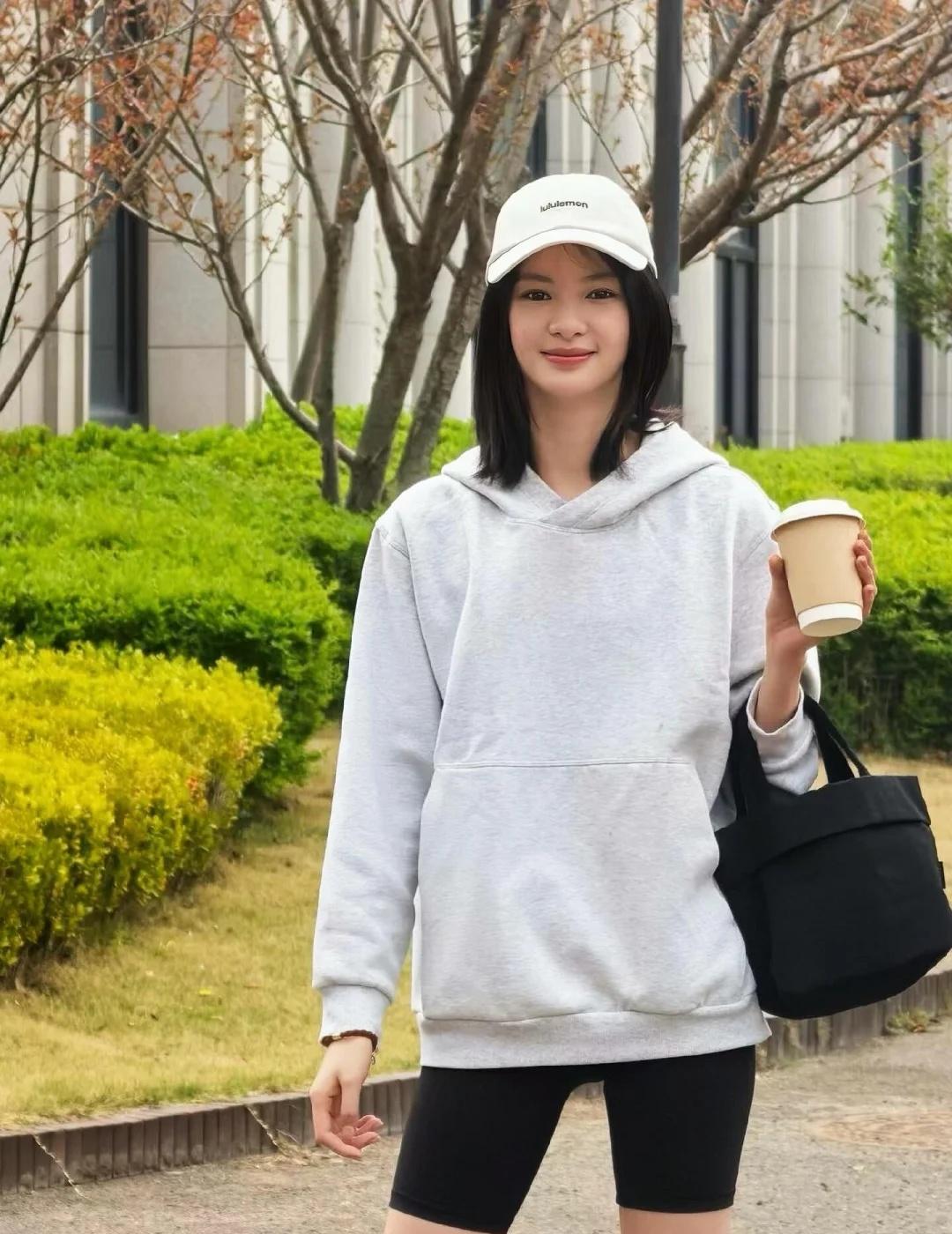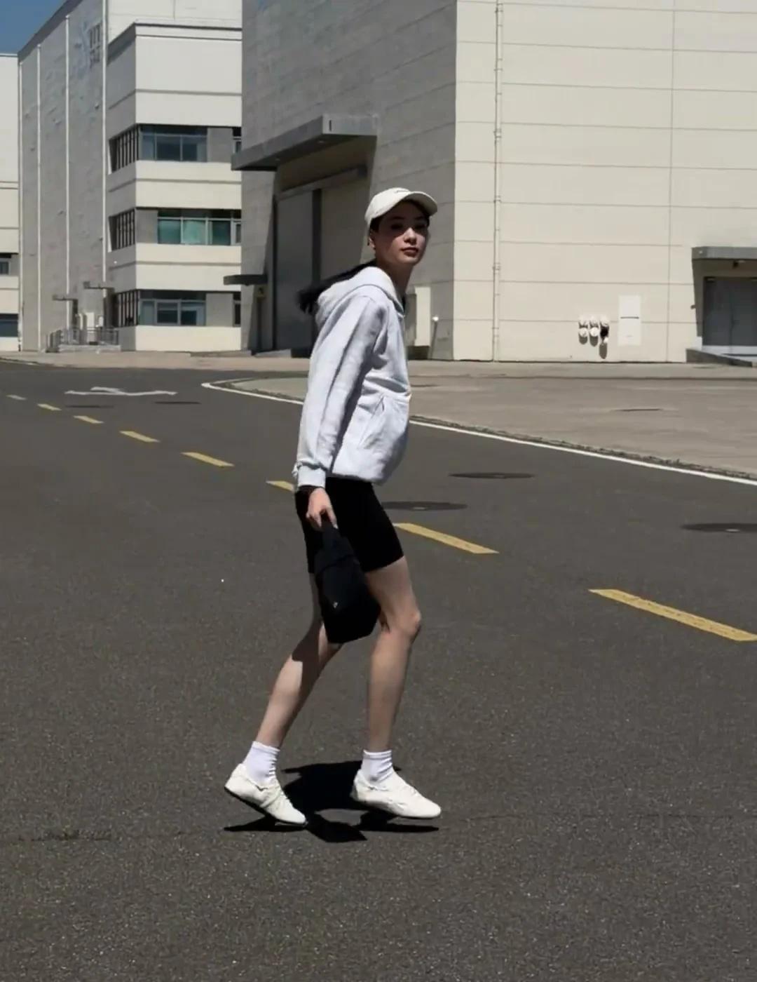 今天邱天分享私服照了,简单地灰色连帽卫衣配legging,脚踩一双薄底鞋,松弛又高级!