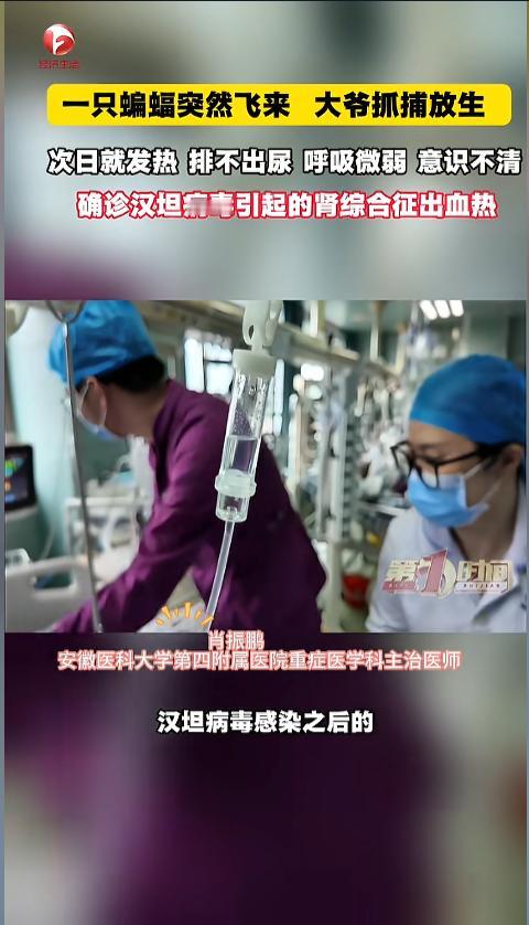 信息来源:《安徽巢湖,家里突然飞来一只蝙蝠 ,大爷徒手抓捕放生,第二天就出现发热、 排不出尿、呼吸微弱、意识不清等症状,原来是汉坦病毒引起的肾综合征出血热。》AHTV第一时间
