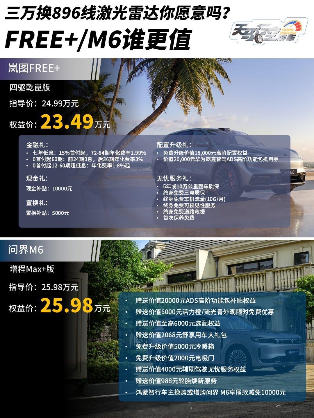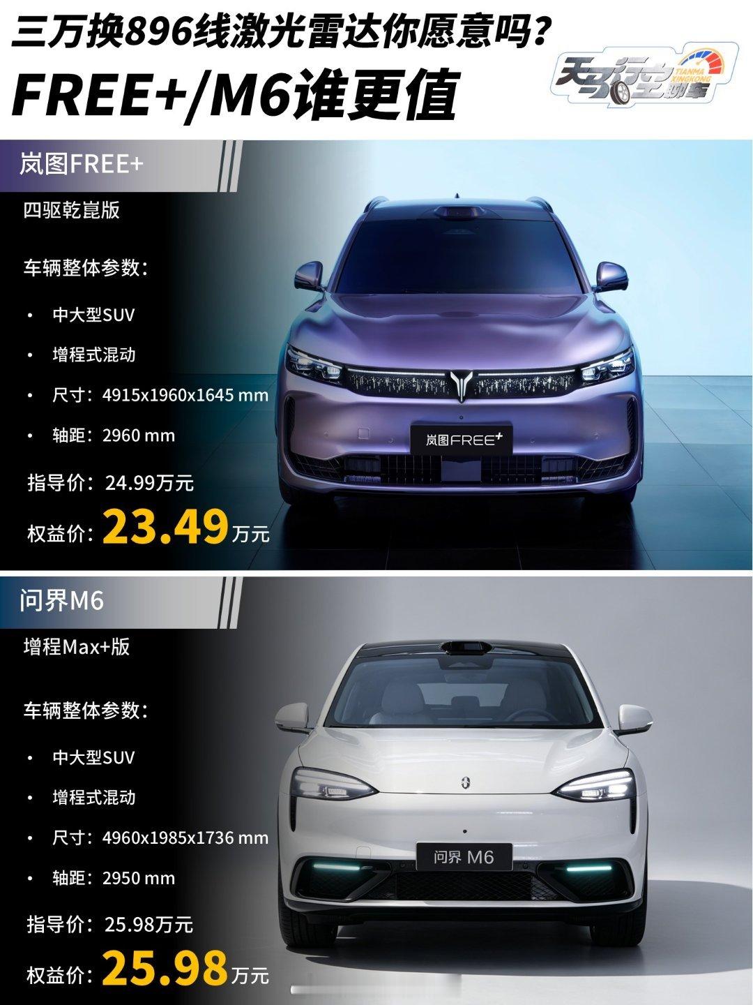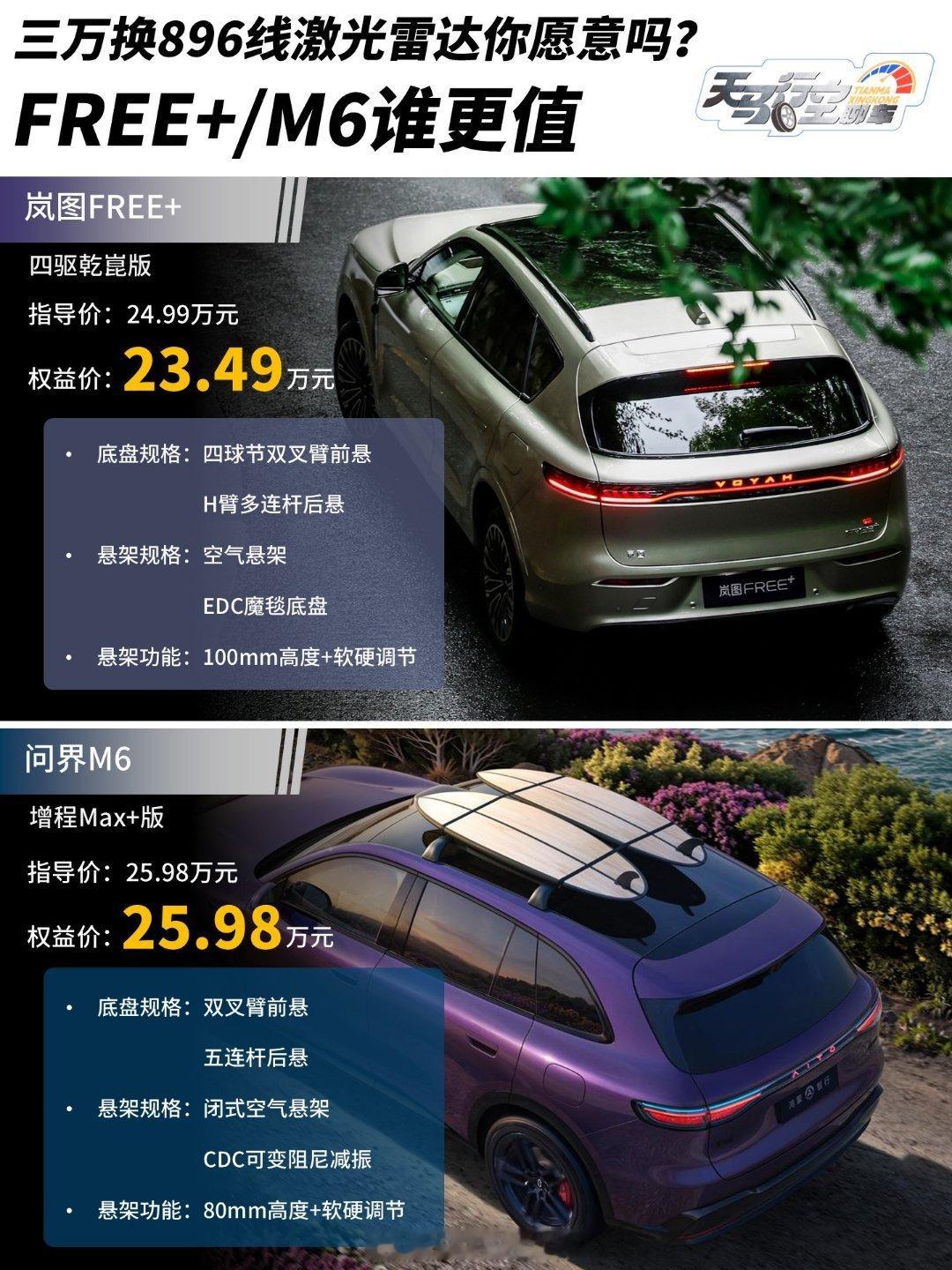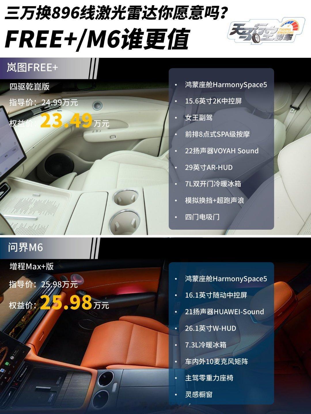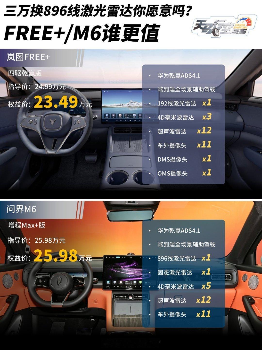 三万换896线激光雷达合算?FREE+/M6谁更值最近问界M6上市,后台好多人问 问界M6和岚图FREE+怎么选?这俩都属于华系大五座增程SUV,确实棋逢对手,华为乾崑智驾ADS 4.1和鸿蒙座舱5都是标配,智能化体验可以说是神仙打架。但仔细盘盘,它们特点又有不同。M6最大特点是华为最新一代896线激光雷达以及配套的传感器硬件组合,还有向日葵屏和灵感橱窗这些带有情绪价值的东西,再加上鸿蒙家族的品牌力,适合对智能化要求极高的消费者。岚图FREE+同样用的华为乾崑智驾ADS 4.1,采用了经过市场广泛验证更成熟的192线激光雷达。岚图FREE+在高级感营造上突出,百万级的全铝底盘,很多高级感的舒适性配置在四驱版都有体现,内外饰用料都符合豪华品牌调性,央企品质背书下在底层技术上也并颇有底气。它们产品力势均力敌,目前问界M6由于刚上市,增程Max+版指导价和权益价都是25.99万,岚图FREE+四驱乾崑版指导价24.99万,权益价23.49万,两车配置基本一致,一个倾向于科技派情绪价值,一个倾向于实用派驾控体验。如果你手握25万,你选谁呢?新车种草