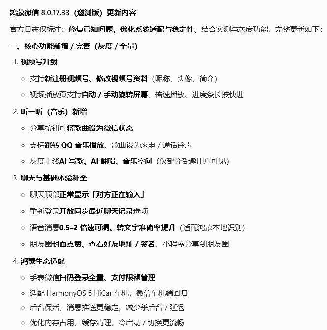 鸿蒙微信8.0.17.33 邀测版(仅受邀用户可更,HarmonyOS 5.0+),官方只写 “修复优化”,实测干货拉满: