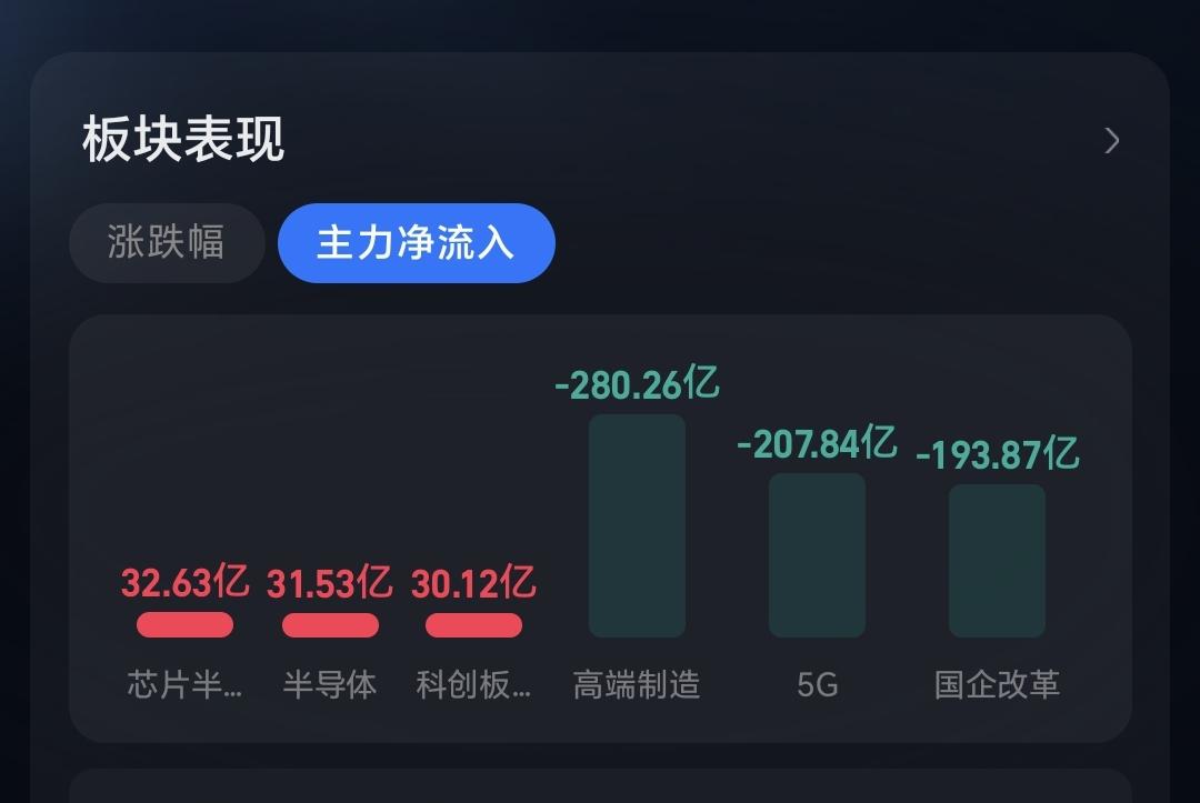 主力资金净流入最多的三个板块是:芯片半导体板块,半导体板块,科创板,主力资金净流出最多的三个板块是:高端制造板块,5G板块,国企板块。