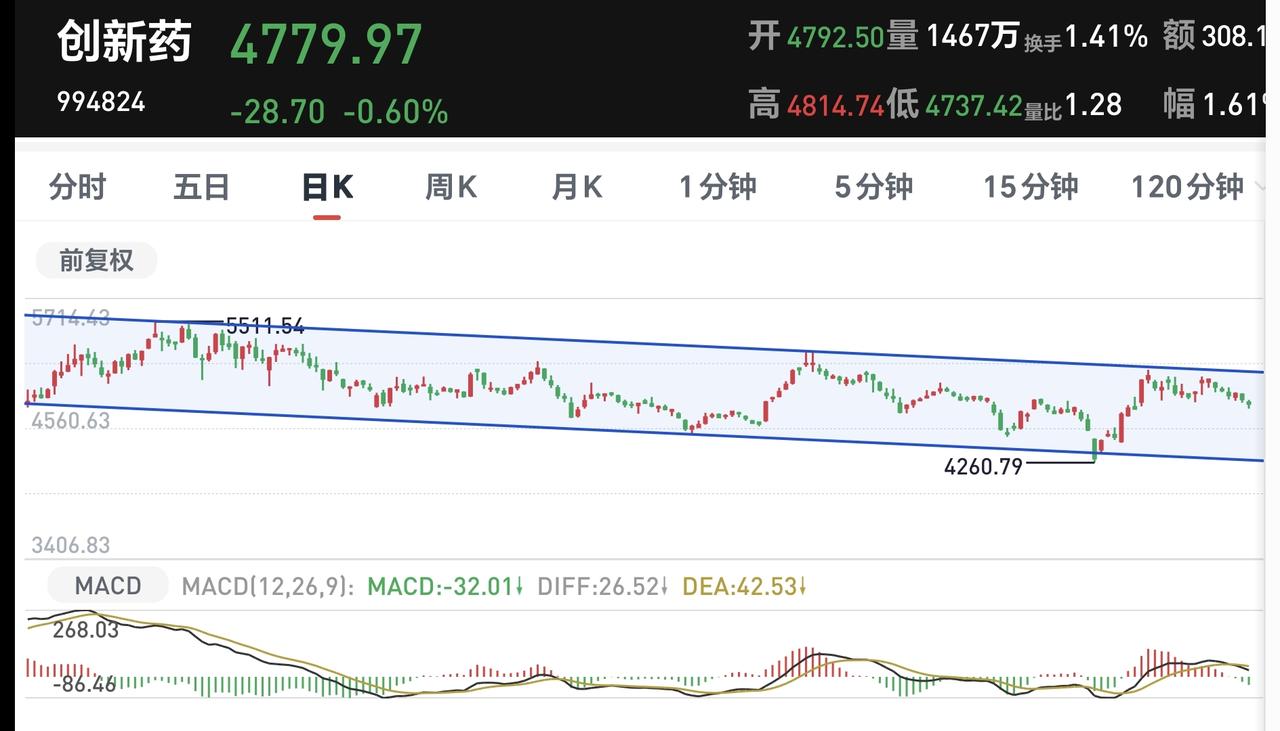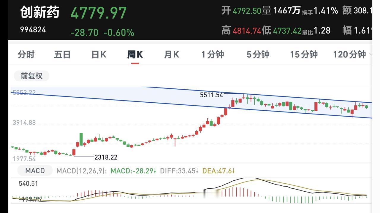 创新药板块日线级别处于下跌通道中,周线级别处于短期下跌通道中,两个通道的时间段是一样的,只要观察日线级别下跌通道就可以了。在上涨突破这个下跌通道上轨线之前,只需要坚持定投,在上涨突破这个下跌通道上轨线的时候,可以考虑要不要进场,但如果下跌来到这个下跌通道下轨线附近,也可以考虑小仓位进场,我现在是每天定投200块钱。