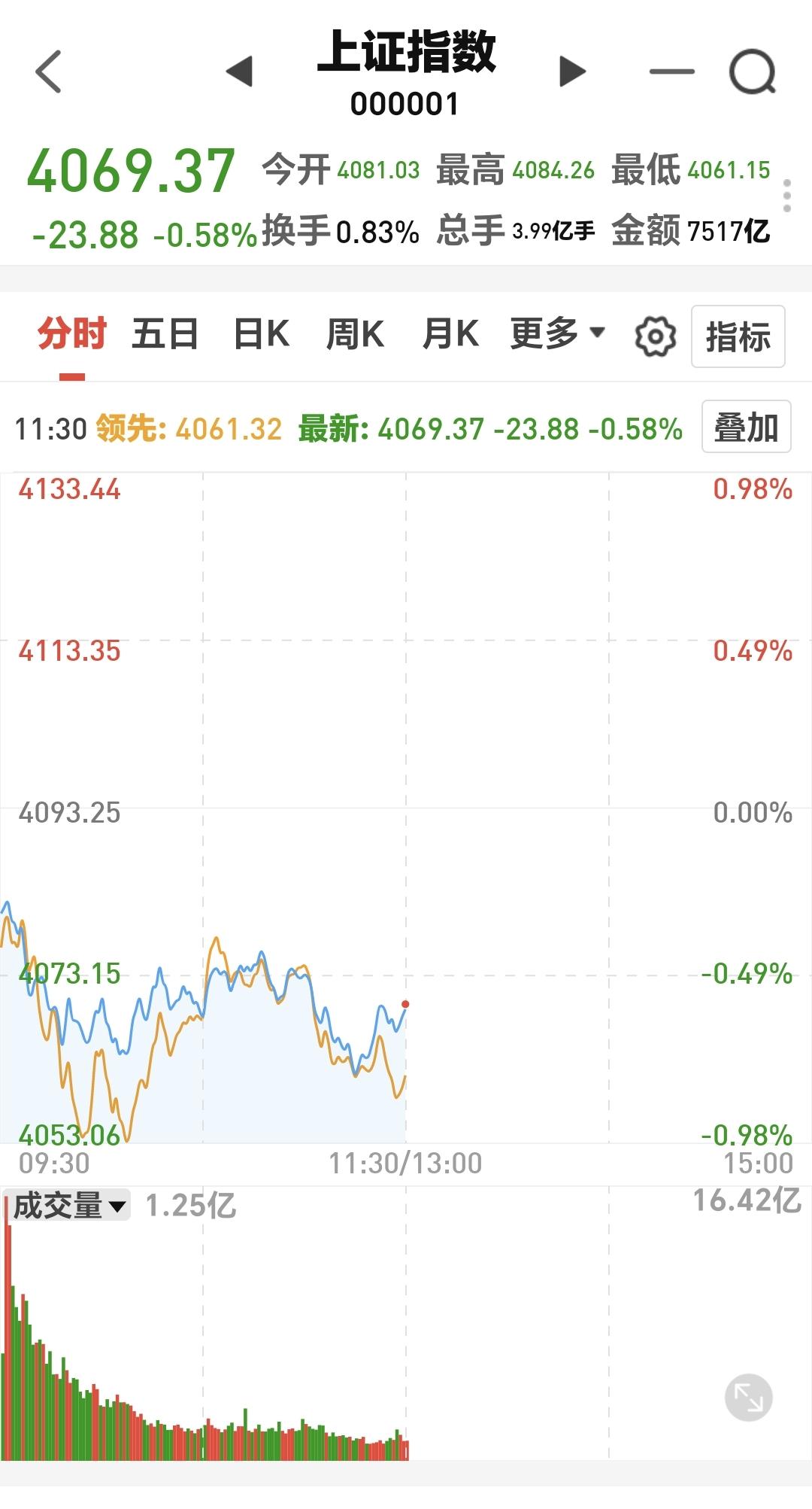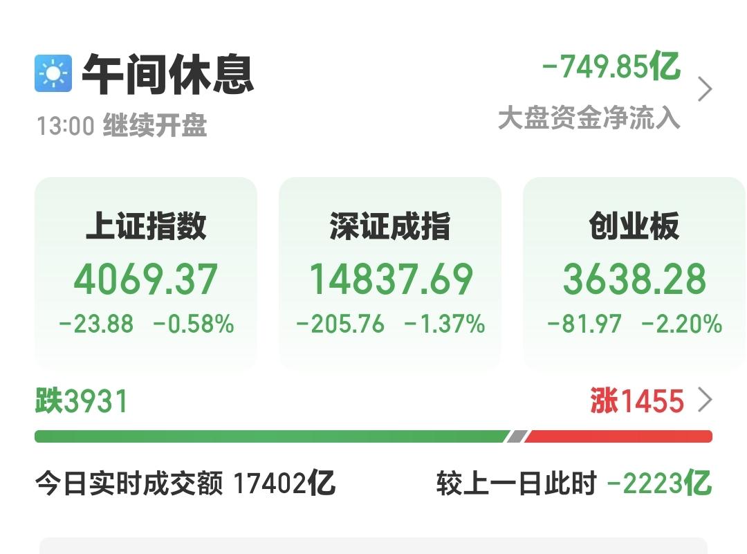 中午收盘的时候,三大指数都是下跌,上证指数下跌了2.20%,收于638点,上证指数下跌了0.58%,收于4069点。