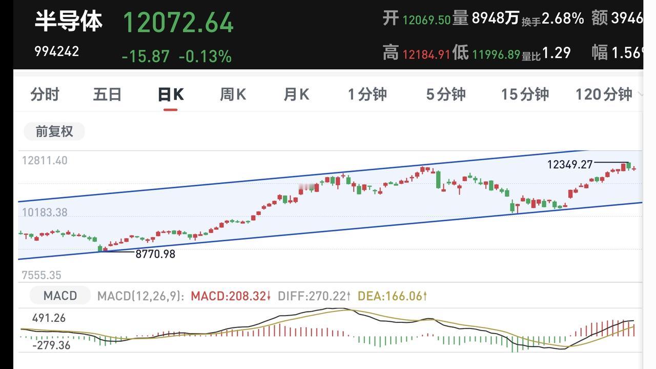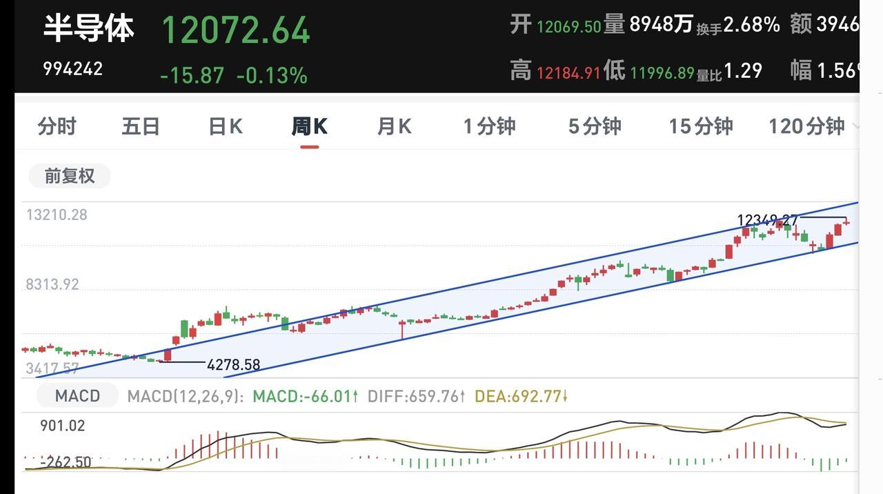 半导体板块日线级别和周线级别都处于上涨通道中,最近很长时间以来都是在上涨通道内震荡,只要不跌破上涨通道的下轨线,持有的人都可以继续持有。