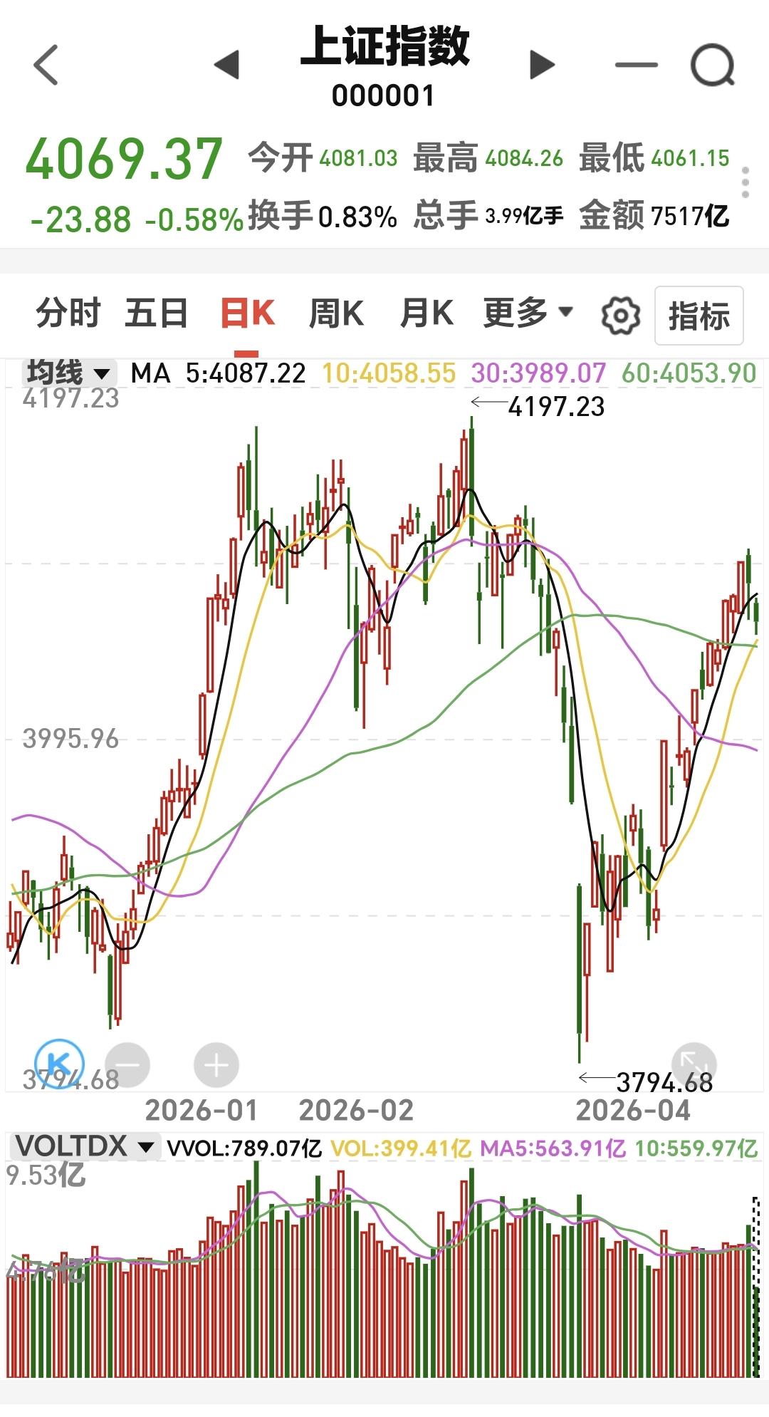 中午收盘的时候,五天线位置是4087点,收在五天线之下,但并没有跌破关键点位4068点,下午继续观察4068点的支撑力度,如果这个点位支撑不住,下一个支撑点位是4021点。