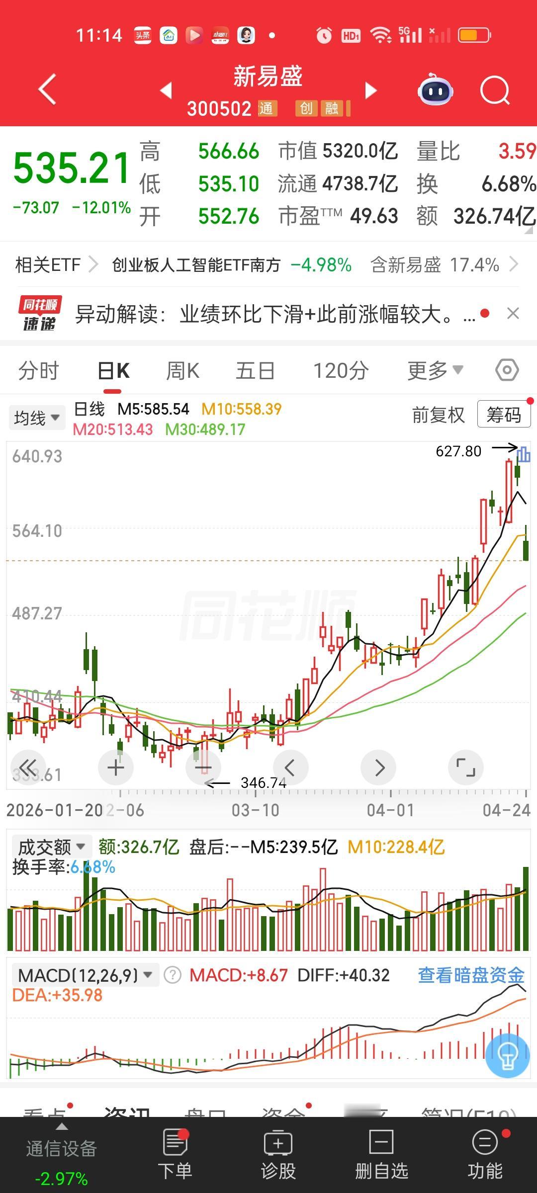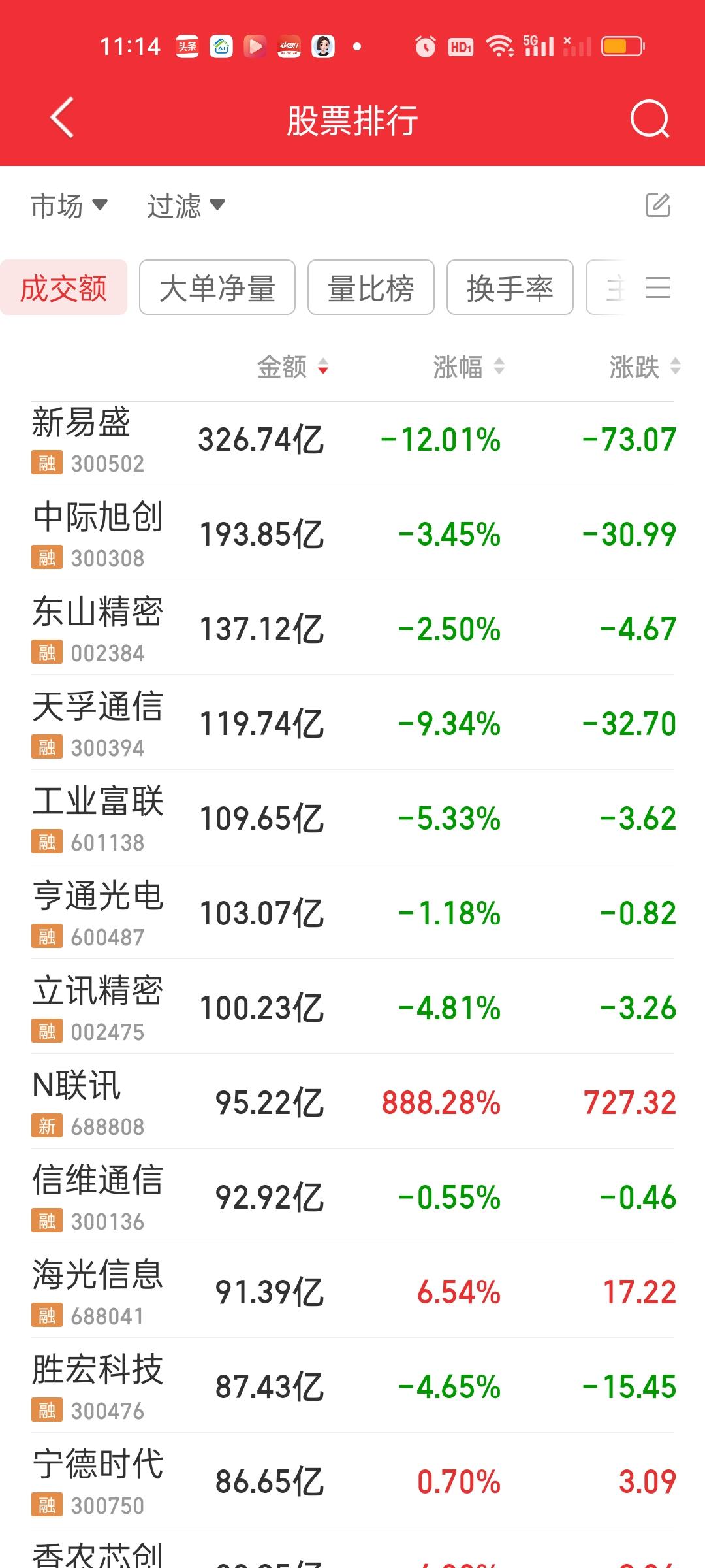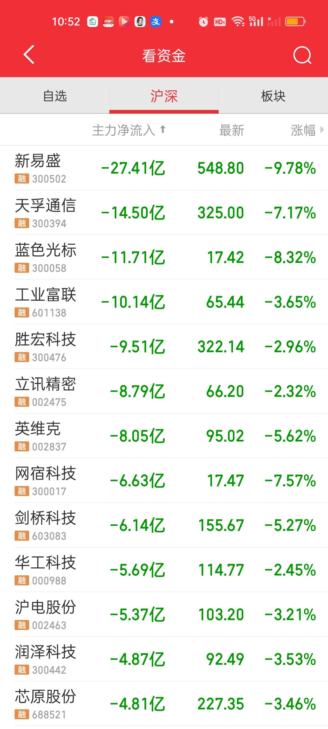 今天的量能缩了2500亿。大盘资金净流出的也不少。个股超3750家下跌,26家跌停。主要是CPO板块的跌幅太大了,新易盛,天孚,胜宏,英维克,沪电无一不是在加速流出。新易盛的成交量甚至已经超过了330亿。