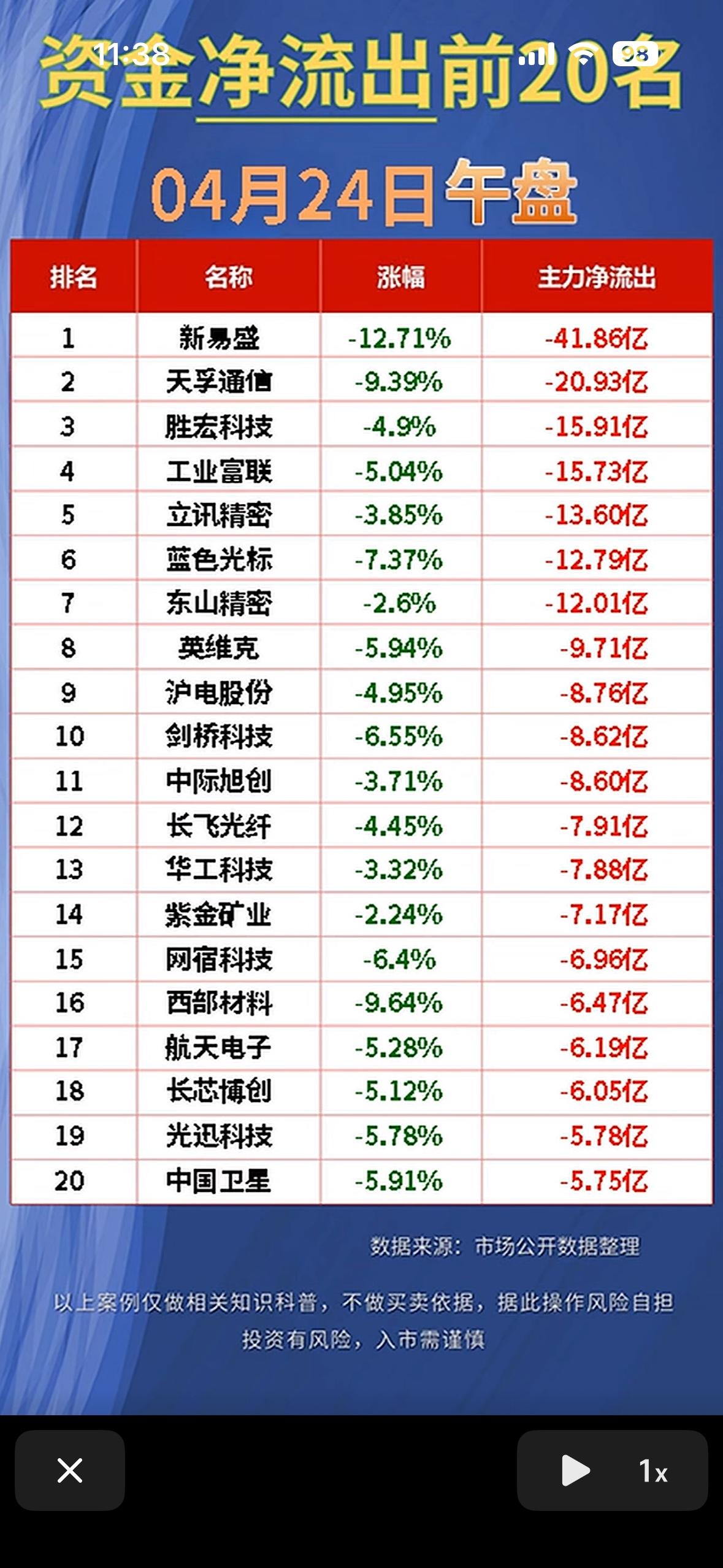“4月24日上午股市风云变幻,前20名净流入与净流出大揭秘!”📈💰