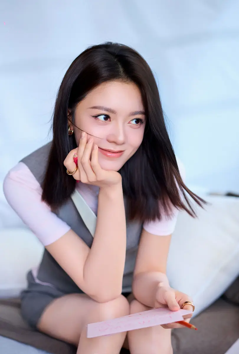 赵今麦穿灰色短裙优雅明媚 托脸甜笑少女感满满