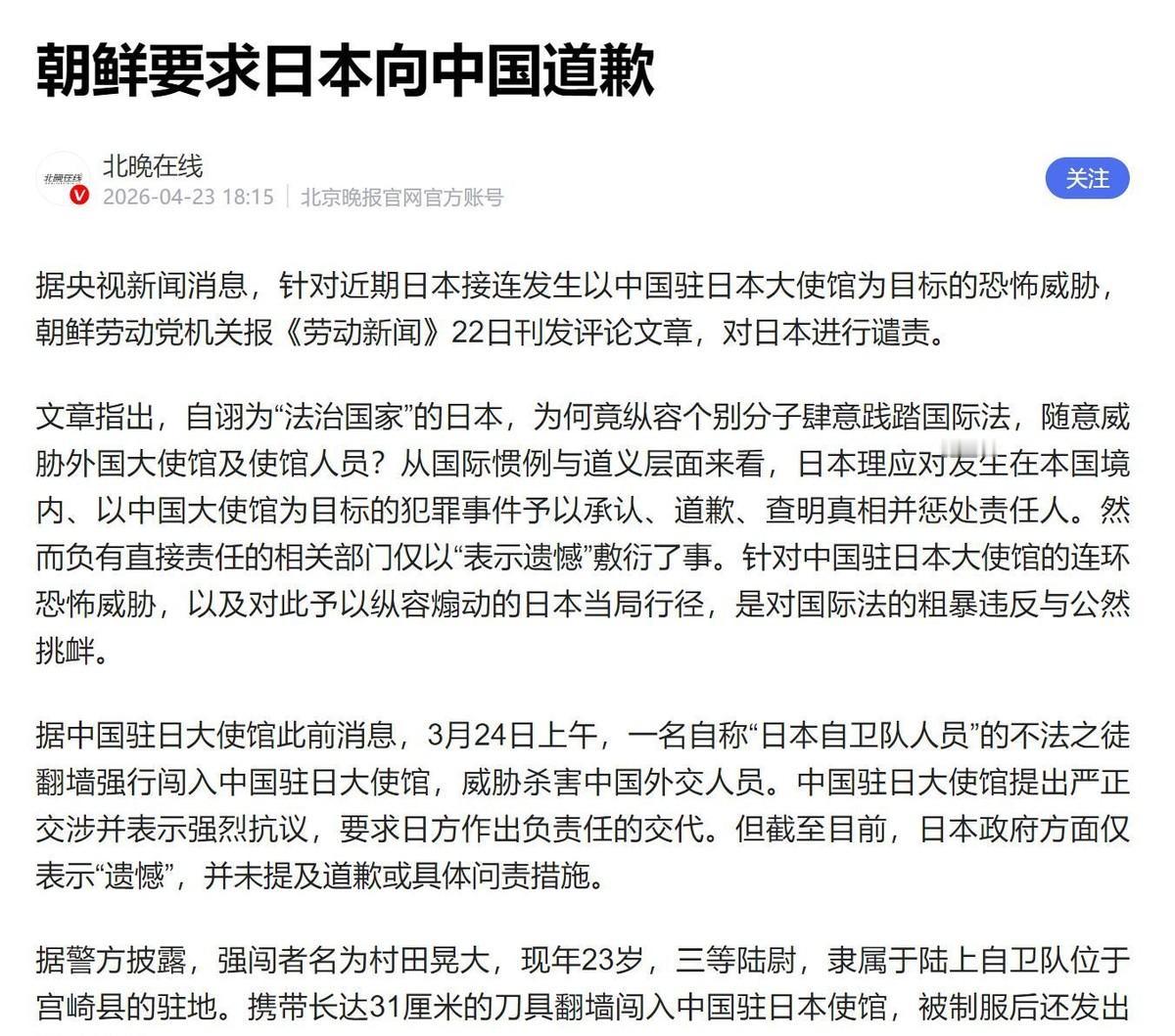 更绝的是,朝鲜这回不仅亲自下场,还在劳动党机关报上直接点名日本。他们硬核要求日方必须为针对中国使馆的恐吓事件公开道歉,这招“四两拨千斤”,彻底把日本的嚣张气焰踩在了脚底。