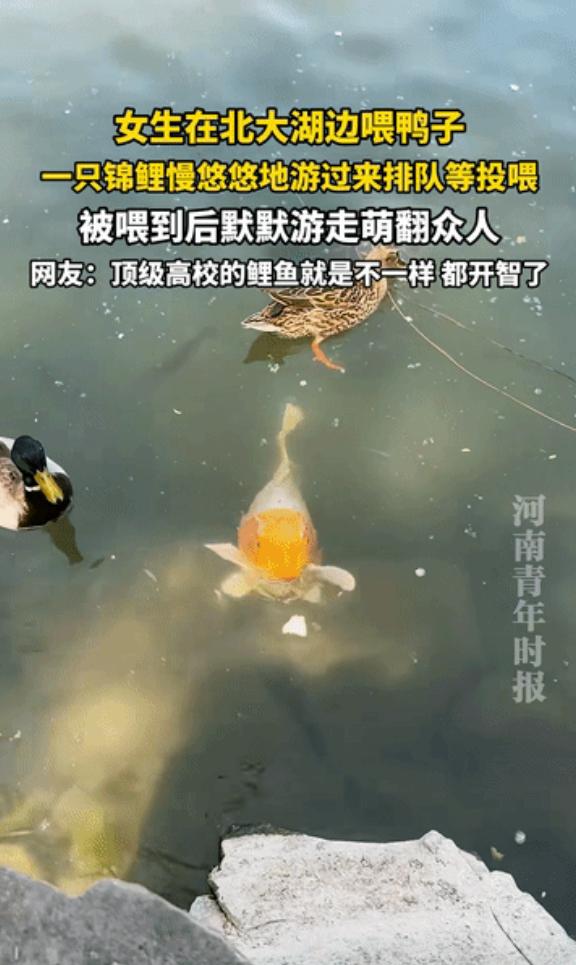 网友震惊了:北京一女生在北大某湖边用面包投喂鸭子,这时从旁边慢悠悠游过来一只胖乎乎的黄色锦鲤,它没有去抢鸭子的食物,而是排在鸭子前面,扬起嘴巴对着女生,那意思是到我了,到我了。