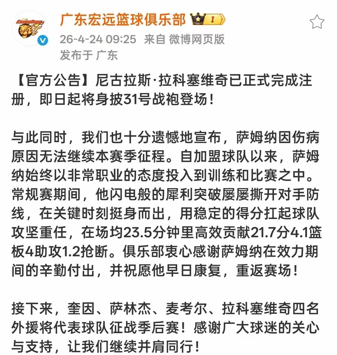 上个赛季得分王萨姆纳被广东宏远裁了,取代他的是外援拉科塞维奇。没办法因为他受伤了,无法继续出征本赛季剩余比赛。