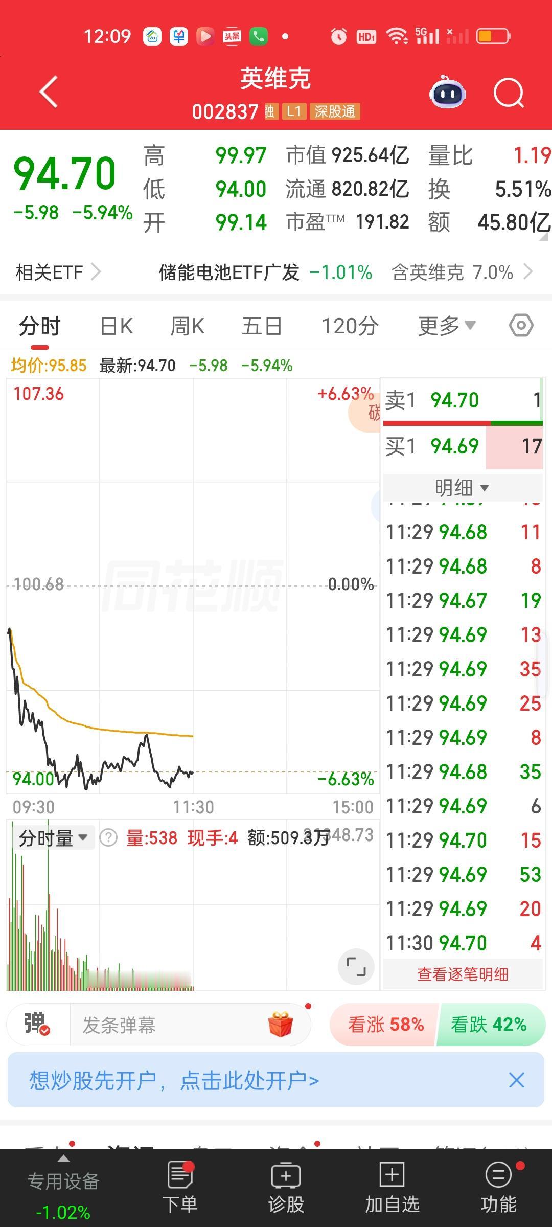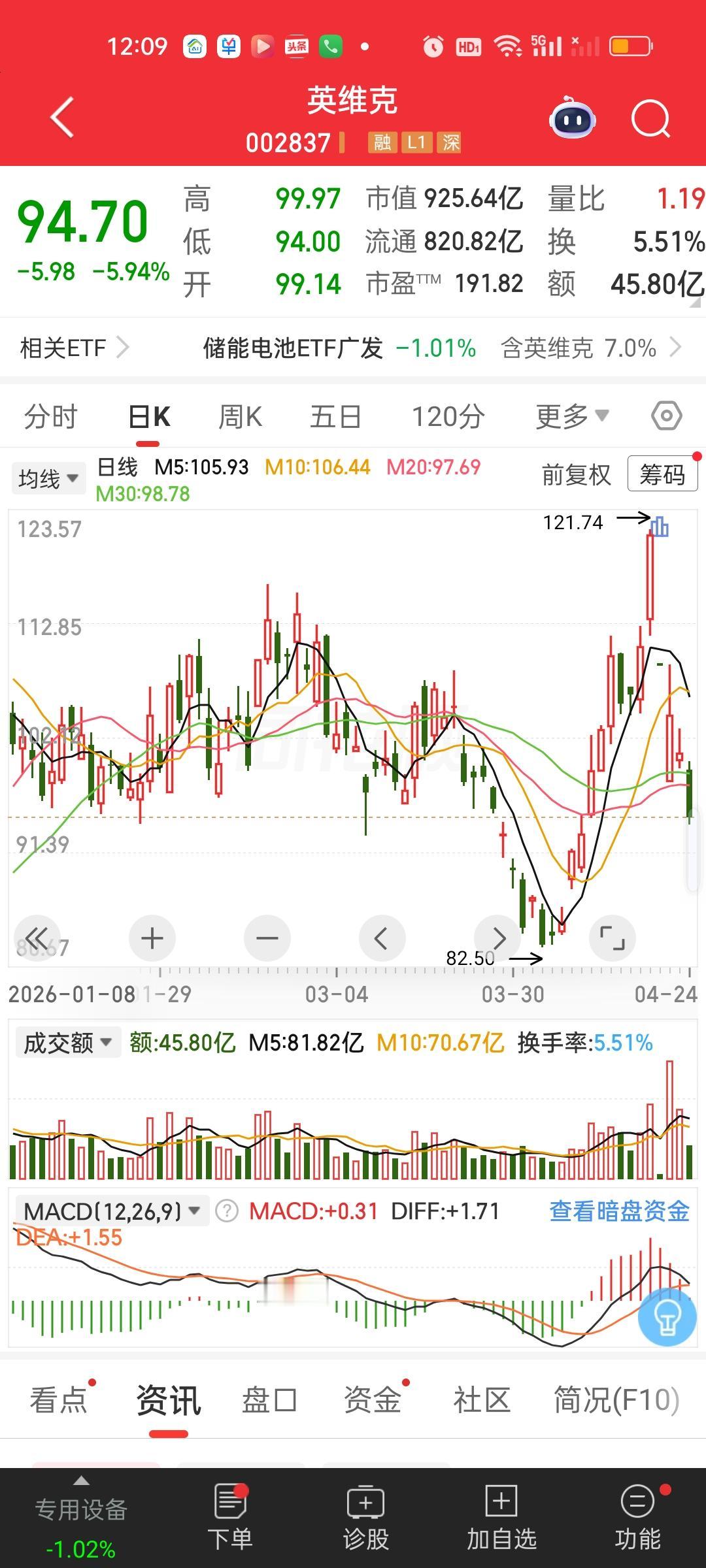 液冷龙头,连续两个交易日跌停开板,假如不是在前天跌停价买入,基本一丁点盈利的机会都没有。今天股价最低杀到了94.00,哪怕在前天跌停价98.07元买入的,昨天微利没走今天也开始亏损了。而且单股亏损已经达到4元左右了。