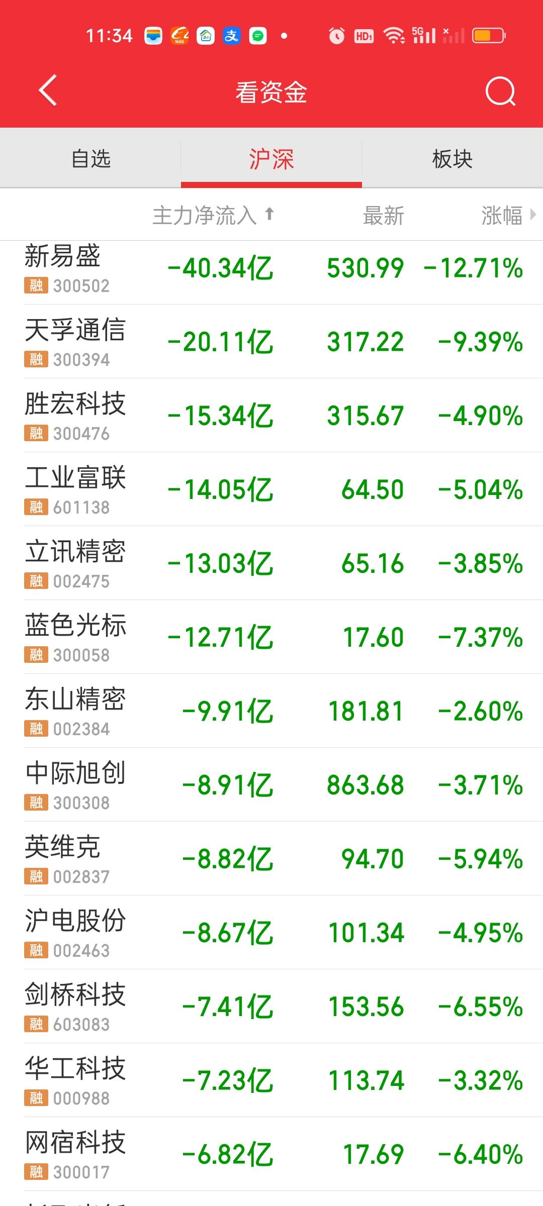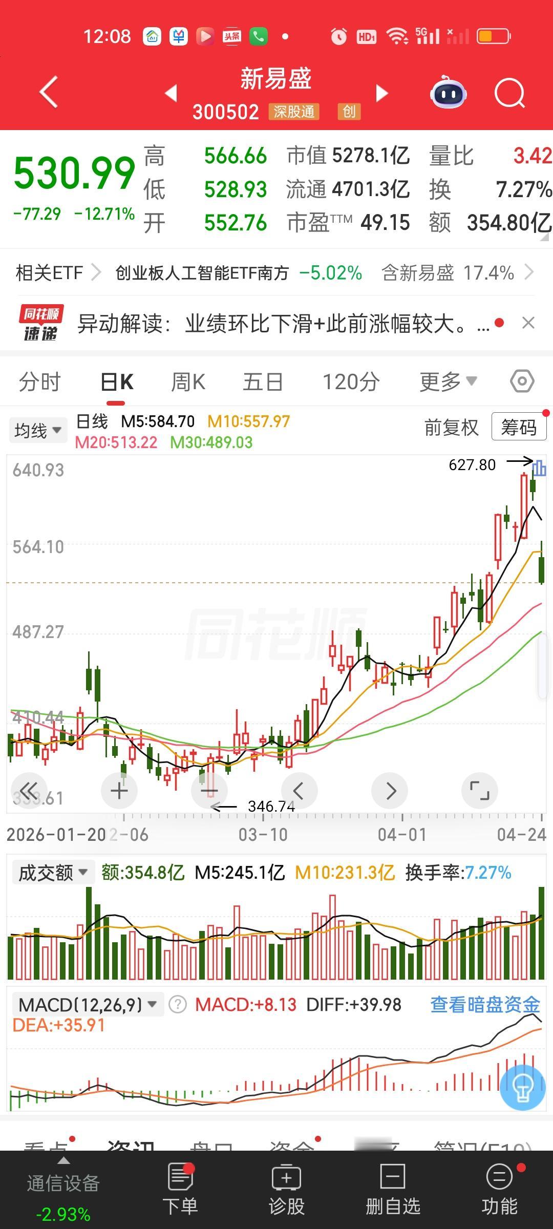 新易盛今天半天成交量就达到了恐怖的354.80亿,上次全天成交额的记录是352.50亿,也就是说半天时间成交量就破了历史记录。而昨天它的股价最高冲到了627.80元,今天最低直接到了528.93元,你说昨天进来赌业绩的,今天一把亏了多少?528.93/627.80=0.8425,直接没了15.75%啊。就按照2手就算,627.80-528.93=98.87 98.87*200=19774。近2W直接没有了。