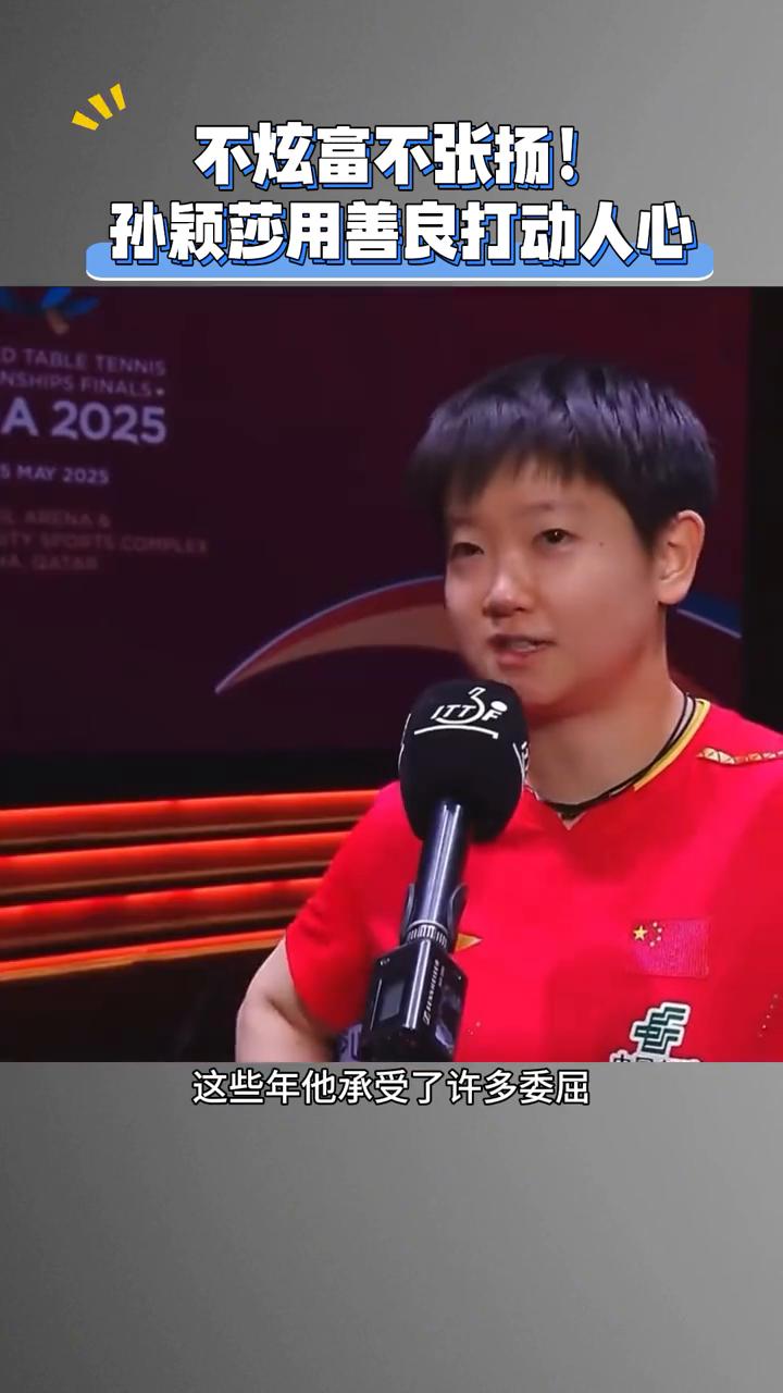 最难得的是孙颖莎有钱却从不张扬,她赚的多却对自己格外节俭。背包是队里发的,脖子上的玉佩一戴就是好多年,很少给自己买贵重物品。可遇到捐款时,她总是默默付出,一笔又一笔,从不对外宣扬。这些年她承受了许多委屈,却从来不说一句,内心的坚韧和担当真的格外让人敬佩。