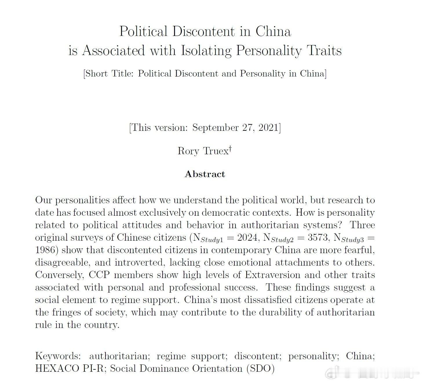 普林斯顿政治系副教授经过研究发现,中国的反体制人士通常是社会上的loser,更容易感到恐惧、性格不合群且内向,且缺乏与他人的亲密情感联系。