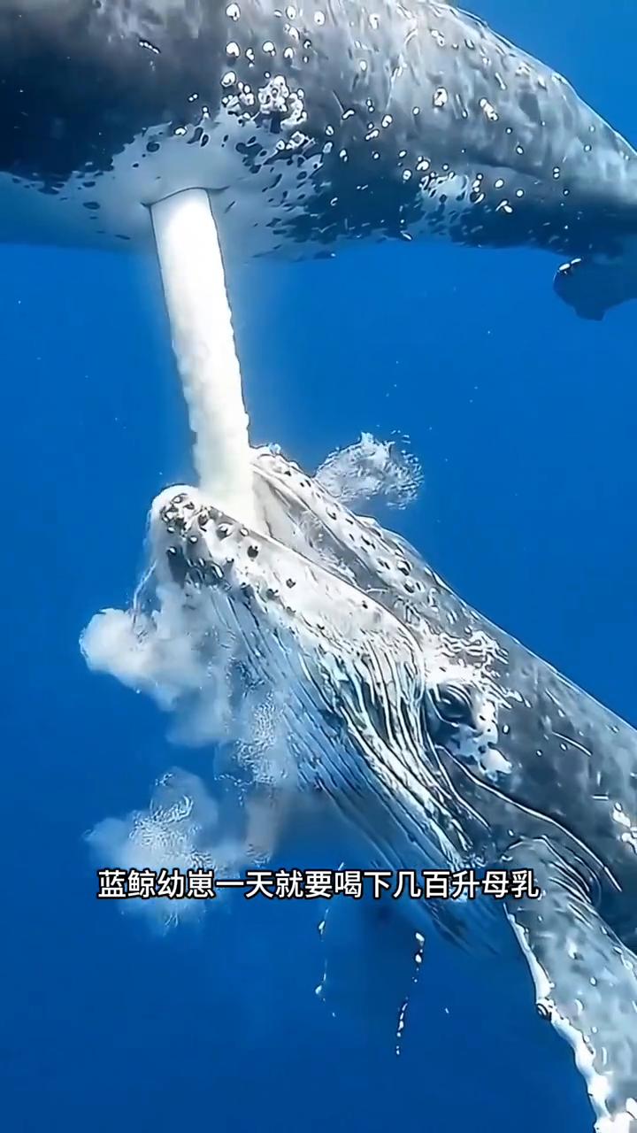 蓝鲸幼崽一天就要喝下几百升母乳,靠着这份超高能量的奶水补给,它们每一天都能疯狂生长,单日体重就能暴涨80-90公斤,成长速度十分惊人。