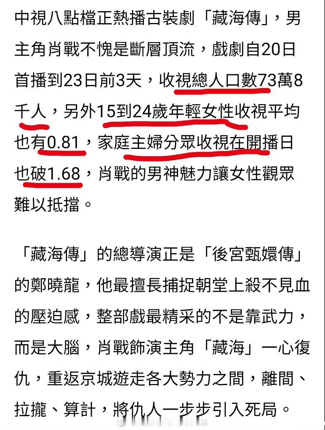 台湾三大主流日报之一的《台湾联合报》报道:肖战魅力难挡,《藏海传》收视狂飙,收视总人口73.8万人,男神魅力让女观众难以抵抗