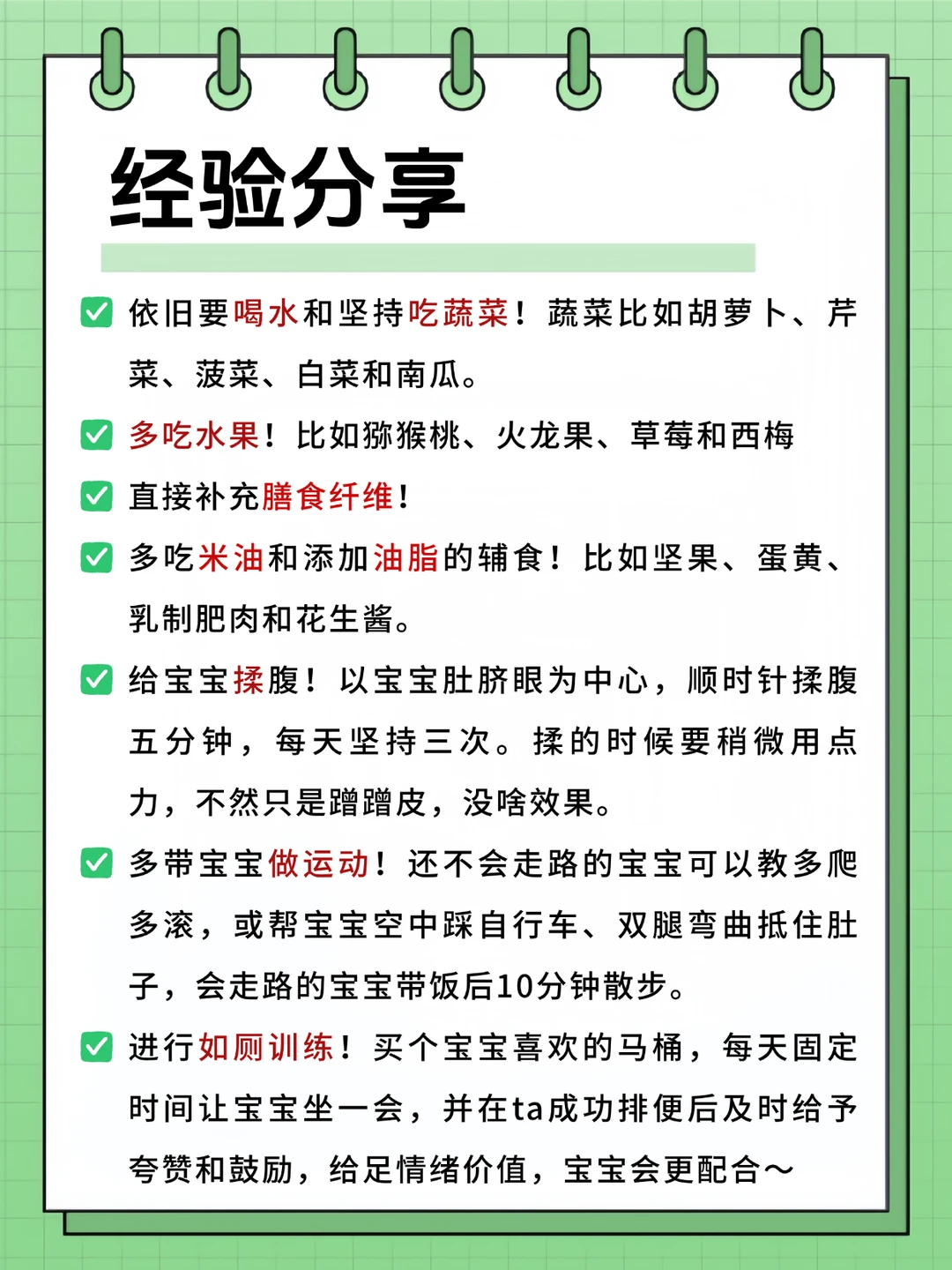 🏃➡️ 做:鼓励宝宝多爬、多活动;养成定时排便,比如安排在早上起床后或吃完饭以后,即使没有便意,也让宝宝坐5分钟;还可以让宝宝用温水坐浴,每天10分钟,水温控制在38℃左右。