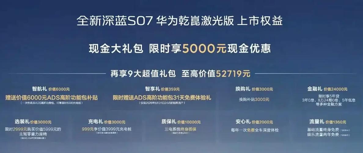 很多人拿了驾照不敢开车,不妨试试带智能驾驶辅助功能的车型。比如全新深蓝S07华为乾崑激光版,其配备了行业先进的华为乾崑ADS 4 Pro增强版,智能驾驶辅助覆盖城区和高速复杂路况,能够让日常驾驶更为轻松省心。城区NCA领航辅助可灵活应对窄道会车、施工改道绕行等复杂路况;高速NCA领航辅助可实现智能上下匝道、变道避障,无需频繁接管。遇到高难停车场景,还有智能泊车辅助帮忙,支持离车泊入、循迹倒车等功能,断头路、小区内狭窄车位泊车,都可精准识别车位边界,对于新手司机十分友好。该车还有全维防碰撞系统CAS 4.0,24项主动安全功能提供全方位守护,避免剐蹭事故,大大提升行车安全。630km纯电续航足以满足日常通勤需求,2周充一次电即可。也不用担心忘记剩余电量,智慧能量管理系统可精准计算剩余里程,让每一段行程都了然于心。全新深蓝S07华为乾崑激光版售价也很给力,享受完官方5000元的限时优惠和9大超值礼包后,15.99万元起即可入手,在同级众多竞品中,性价比可以说非常高了。