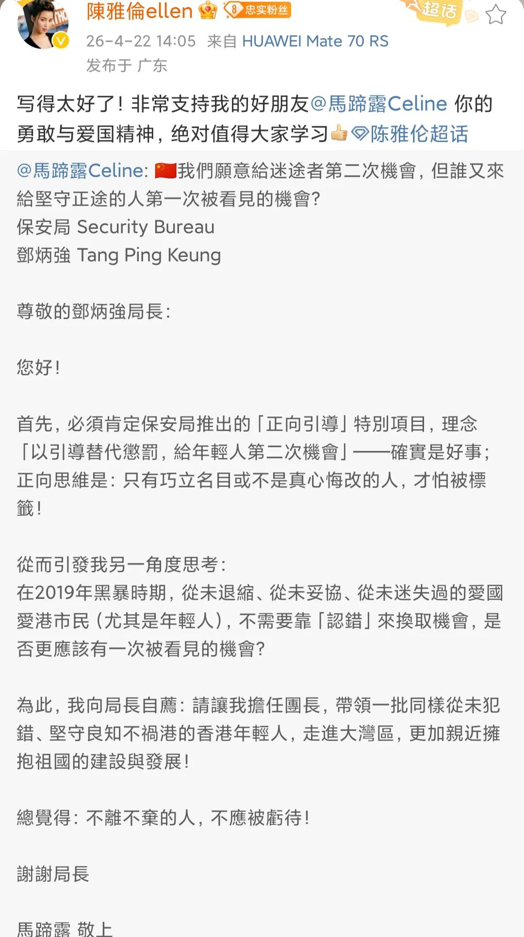 在大家失望之际,22日八九十年代电影圈女神陈雅伦在个人社交账号上转发了马蹄露的公开信,大赞马蹄露写得好,她还说非常支持马蹄露的勇敢和爱国精神,绝对值得学习。