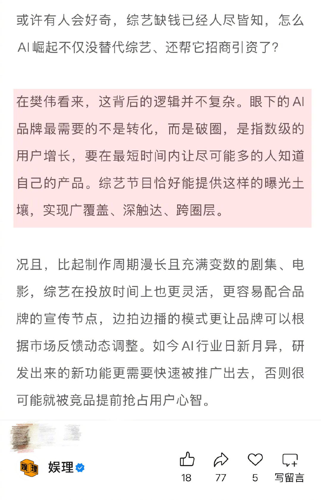 80%综艺冠名商已变成AI软件 AI能让内娱综艺躺赢吗 综艺导演杜锐琪说:“AI不懂共情,不会共情。节目最好看的那些瞬间,都不是台本里写的‘程序’,而是人与人之间的真情流露。”综艺或许能在AI时代凭借这一点“逃过一劫”,但它自身招商难、项目缩水的结构性困境,AI的到来并没有真正解决。躺赢的底气有了,难关还在。