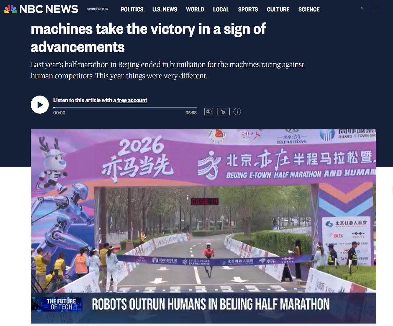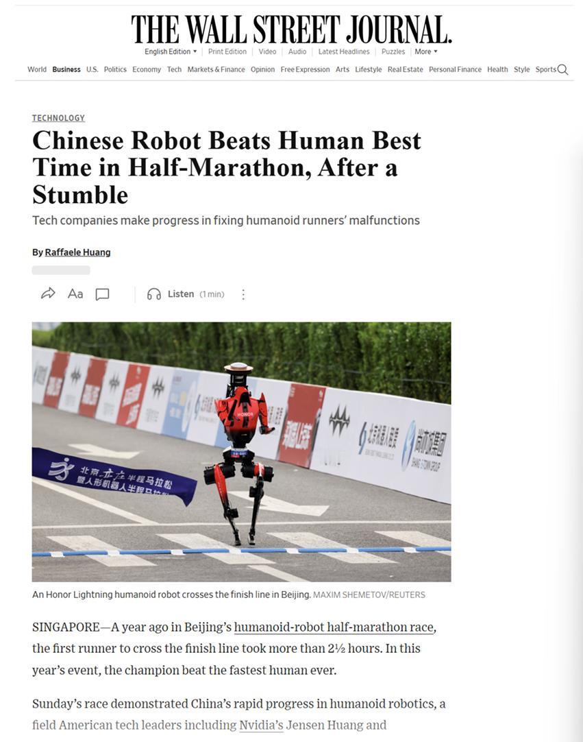 50分26秒打破人类半马纪录,包揽赛事前六名,把一众老牌机器人厂商甩在身后。这下外媒集体破防,从《纽约时报》到BBC,全在惊呼“科幻照进现实” 。
