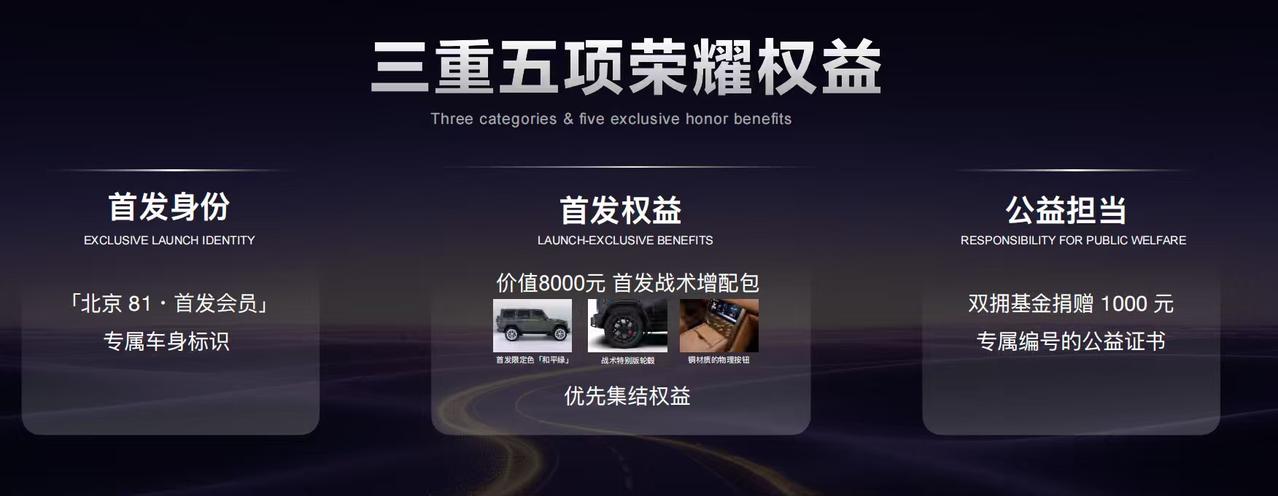 【2026北京车展:北京81正式开启盲订】4月24日,2026北京车展上,北京81正式开启盲订,新车预售价20万元-25万元。新车传承家族式经典基因,前大灯传承“天圆地方”的设计理念,将方形外壳与圆形灯体巧妙融合,既有东方美学的韵味,又契合硬派越野的硬朗气质。全新设计的双七条辐轮圈,采用枪灰色涂装,质感十足,内置醒目的红色制动卡钳,提升了整车的运动气息。新车还配备了车顶行李架、侧踏板等越野实用配置,进一步强化了其硬派越野属性。北京81使用305宽胎,搭配前六活塞、后四活塞高性能刹车。车尾灯组则采用了四个方形设计,与大灯组的“天圆地方”理念形成互补,造型简约硬朗,点亮后辨识度较高。后包围造型相较于1.0版本更加宽厚,线条粗壮,不仅提升了车辆的通过性,更增强了尾部的视觉厚重感,同时配备了实用的拖挂钩,满足用户越野牵引、户外露营等多元化需求,进一步强化了车辆的越野实用性。【来自懂车帝车友圈】