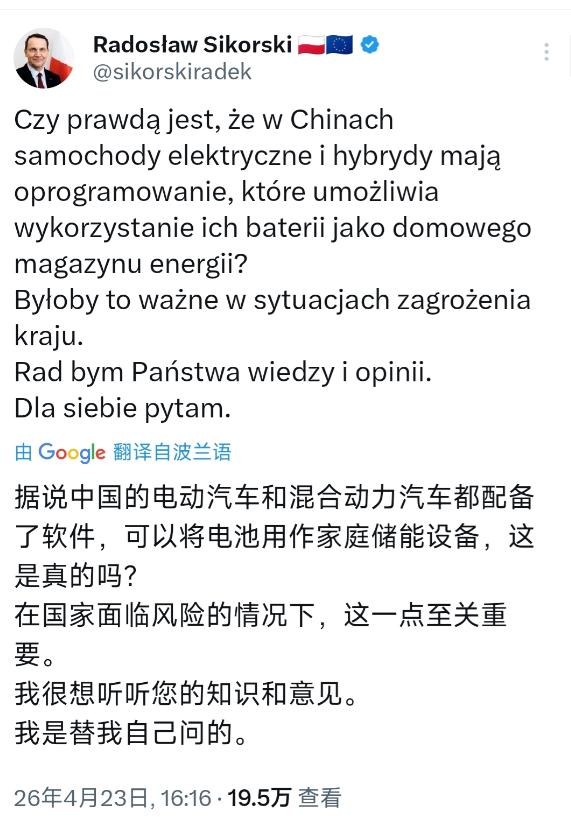 4月23日,波兰副总理兼外长西科尔斯基,在社交平台上问了个实在问题:中国的电动汽车、混合动力汽车,是不是都装了软件,能把车的电池当成家庭储能设备用?他还说这事在国家有风险时特别重要,自己是真心想知道答案。