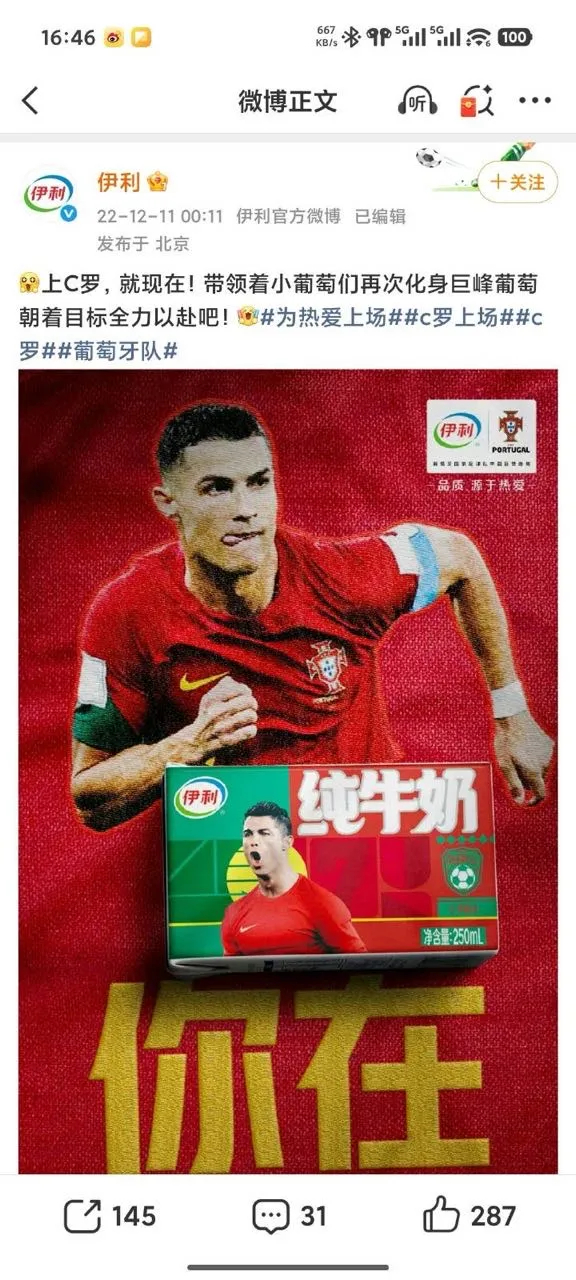 C罗曾代言伊利 我记得C罗以前不是代言过伊利吗? 怎么现在不喝牛奶了,可能是只代