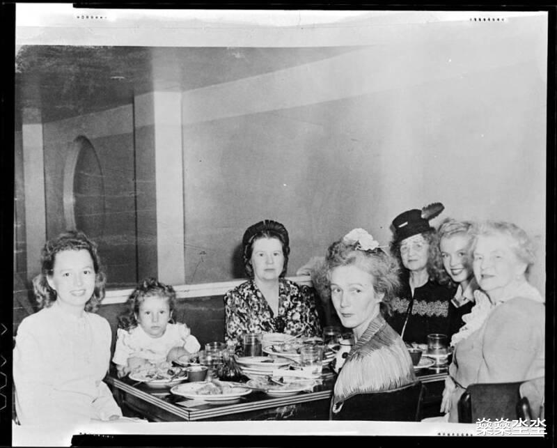 新婚不久的梦露(最右)与家人一起用餐,其中包括她的母亲格拉迪斯