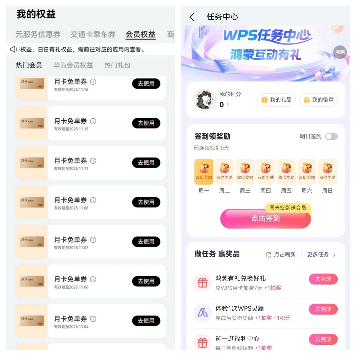 顺便提一句,升级鸿蒙5.1及以上系统的用户兑换会员后,记得去参加专属的签到和任务活动,有机会抽华为Mate X6、华为手表GT6和WPS年卡。万一顺手抽中了个折叠屏呢?