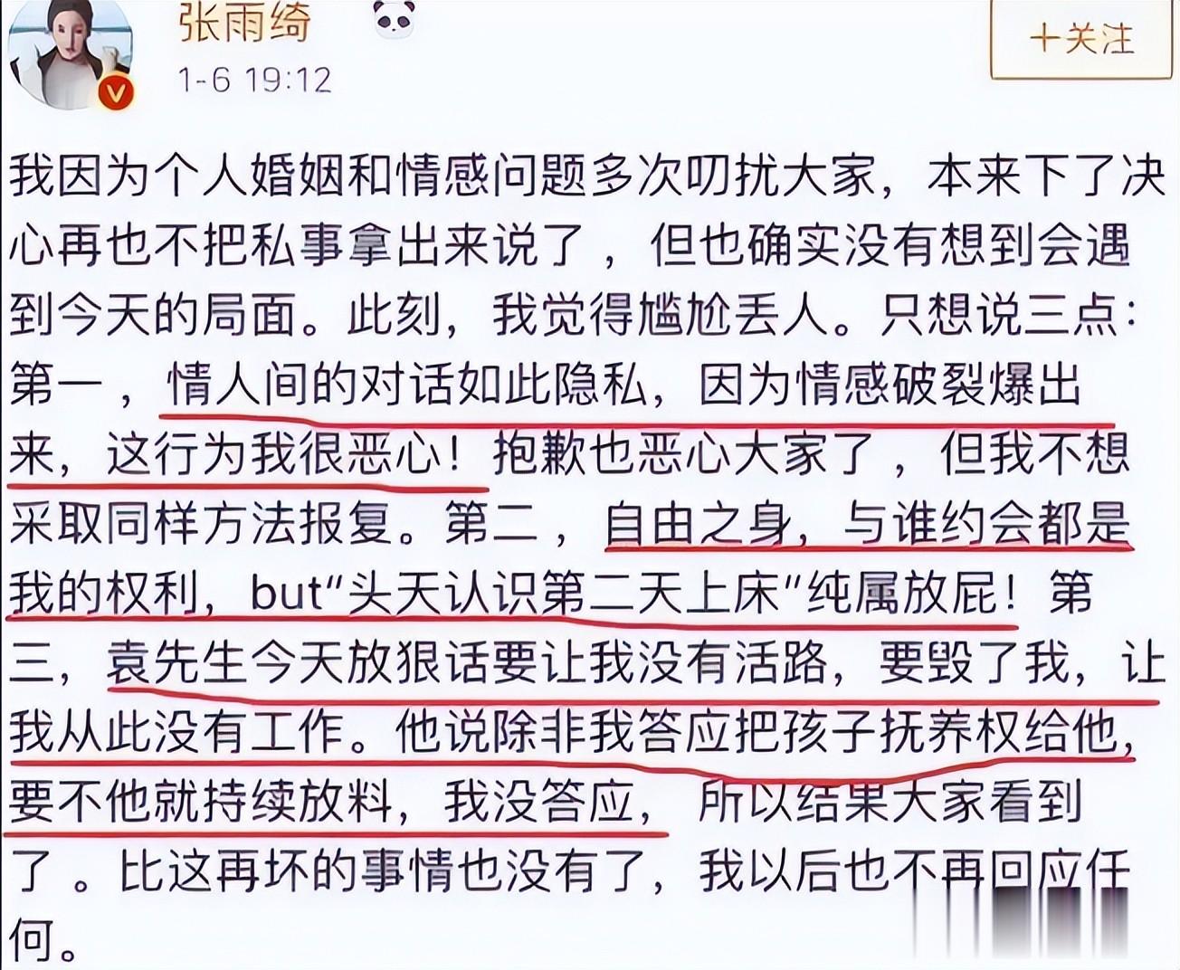 张雨绮当时倒是果断,第二天就宣布离婚,还圈了一波 “敢爱敢恨” 的粉。