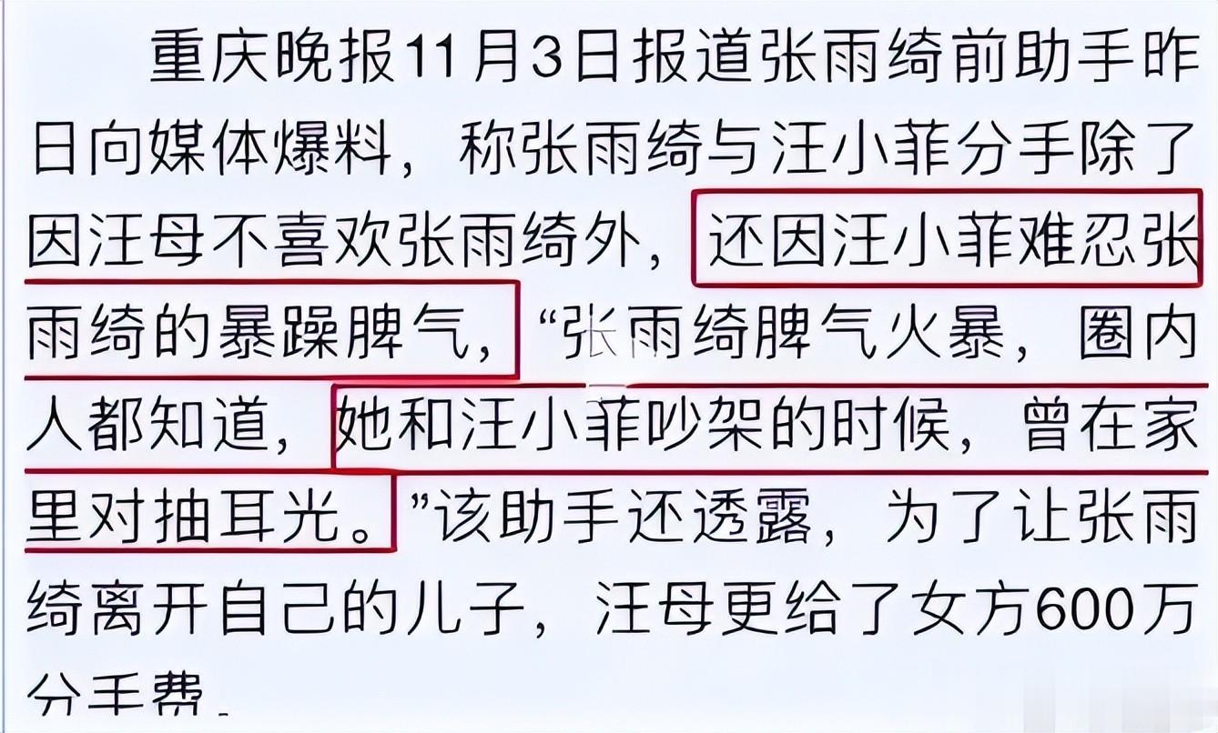 可这段感情没维持多久就闹掰了,原因是两人性格都太强势,一次汪小菲忘了约会去陪朋友,张雨绮直接冲到他家质问,还发生了肢体冲突,最后不欢而散。