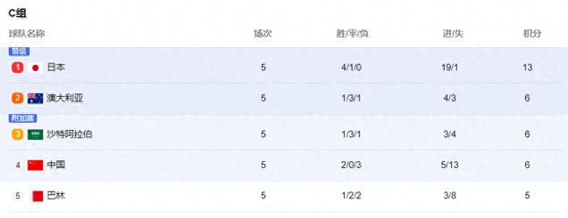五轮过后,沙特男足总成绩为1胜3平1负积6分,积分与中国男足持平,但净胜球占据优势,排在积分榜第三的位置。